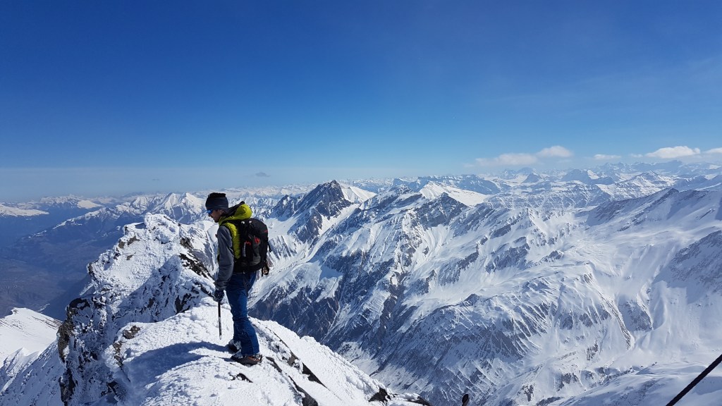 Bei etwa 2800 m.ü.M. deponieren wir die Skis und gehen mit Steigeisen und Pickel bewaffnet auf den Westgrat. Diesen kann man einfach verfolgen bis auf den Hauptgipfel des Piz Terri. Es windet ziemlich stark und ein verweilen auf dem Gipfel steht ausser Frage. Darum steigen wir auch gleich wieder ab zu den Skiern, mit welchen wir gleich noch weiter abfahren um ein wenig aus dem Wind zu sein.