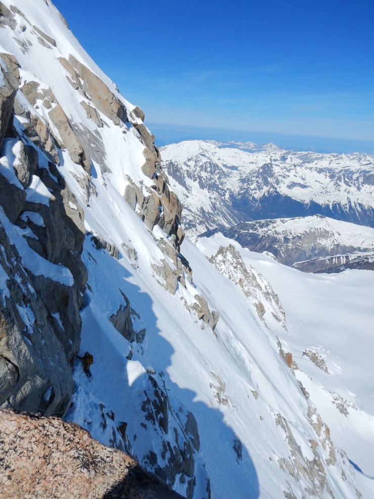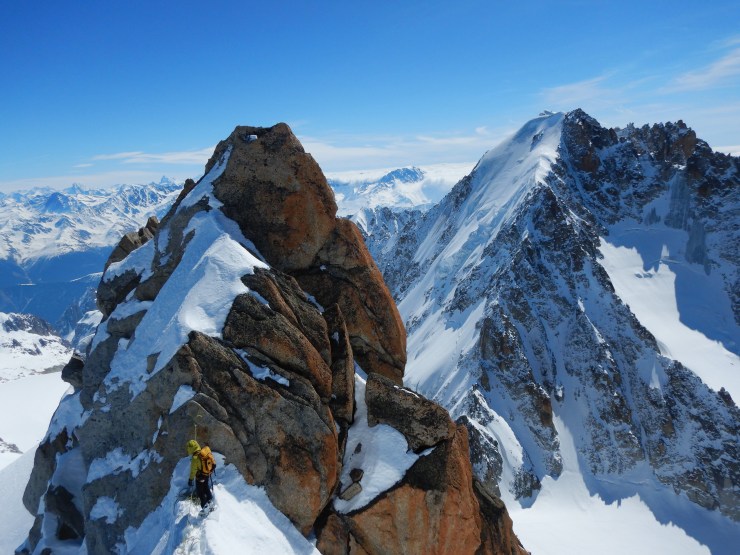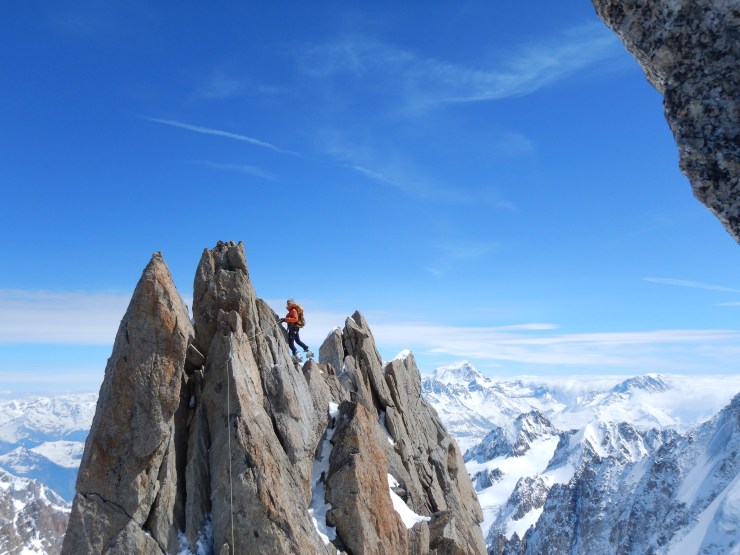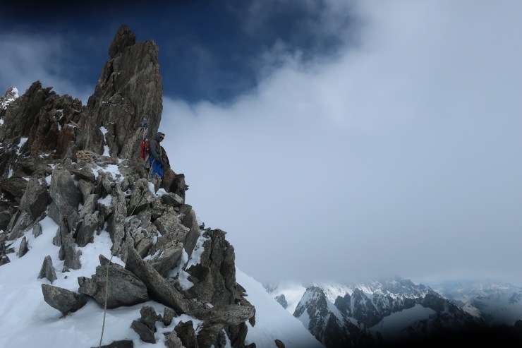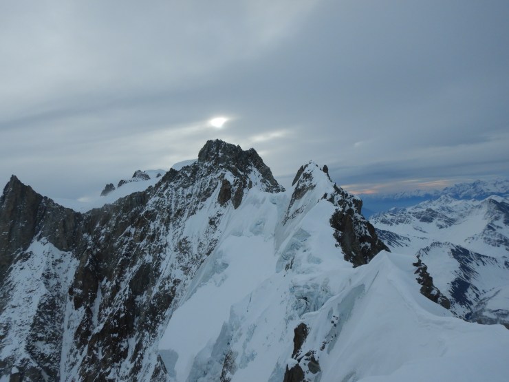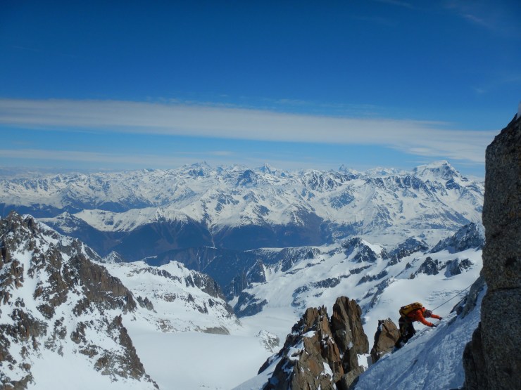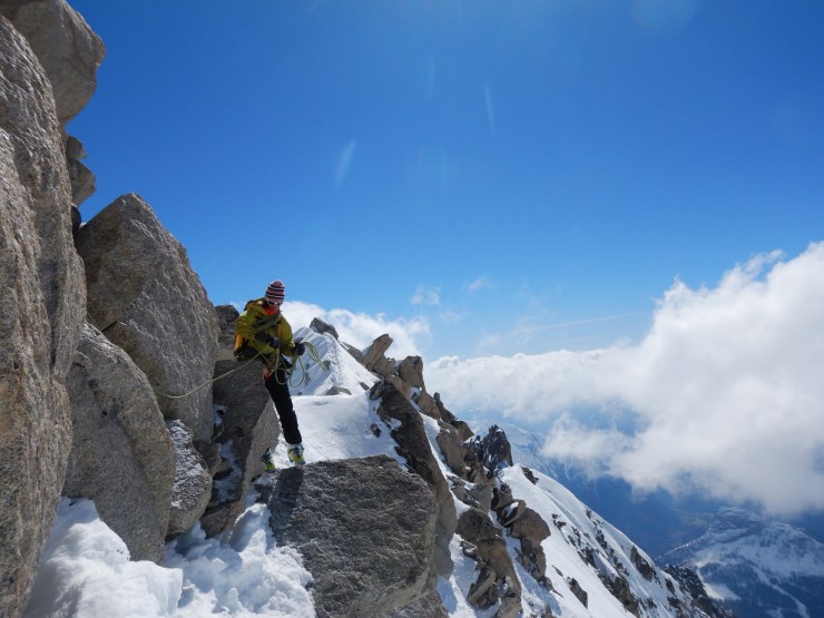 Gefühlt Minuten später stehen wir wieder bei den Skiern. Es ist erst Mittag und wir entschliessen uns noch der Aiguille d’Entrèves einen Besuch abzustatten. Kurzes zögern beim Einstieg wenden wir mit der Begründung, dass es auf dem Gipfel der Tour Ronde auch nicht allzu stürmisch war ab und schnallen die Skis auf den Rucksack. Wieder angeseilt steigen wir über einfaches Gelände über den Grat. Hier kann sehr gut über Zacken gesichert werden und wir kommen zügig voran.