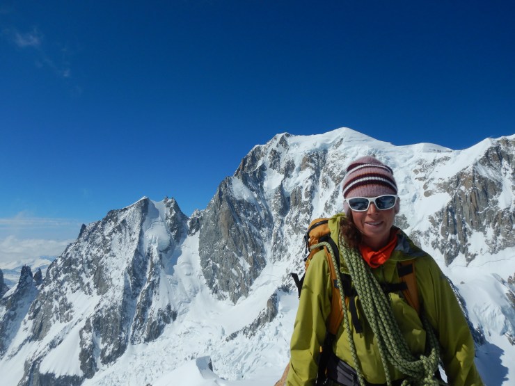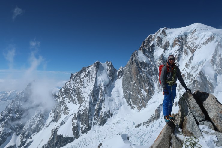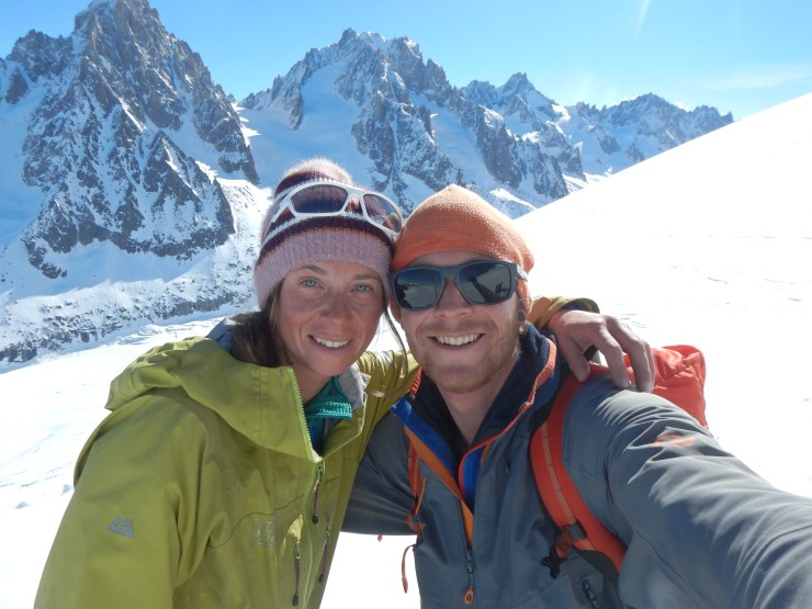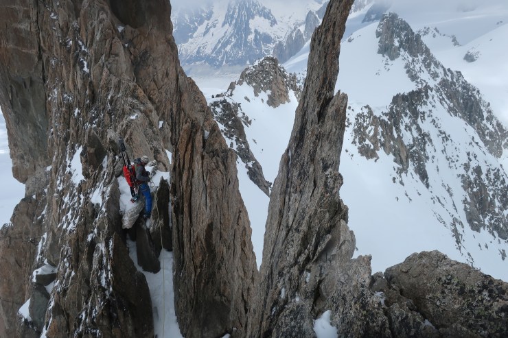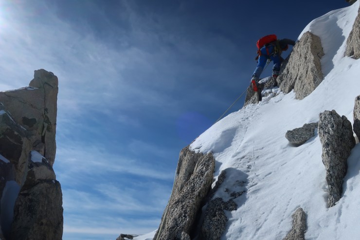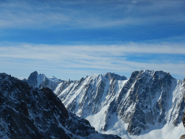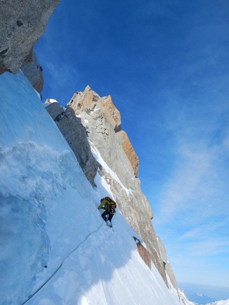 Gefühlt Minuten später stehen wir wieder bei den Skiern. Es ist erst Mittag und wir entschliessen uns noch der Aiguille d’Entrèves einen Besuch abzustatten. Kurzes zögern beim Einstieg wenden wir mit der Begründung, dass es auf dem Gipfel der Tour Ronde auch nicht allzu stürmisch war ab und schnallen die Skis auf den Rucksack. Wieder angeseilt steigen wir über einfaches Gelände über den Grat. Hier kann sehr gut über Zacken gesichert werden und wir kommen zügig voran.