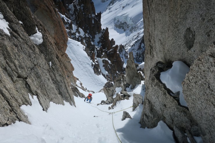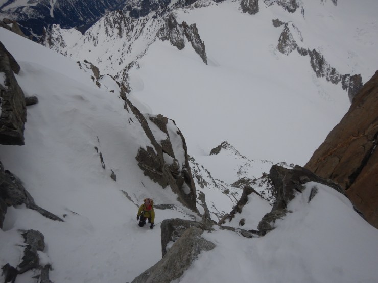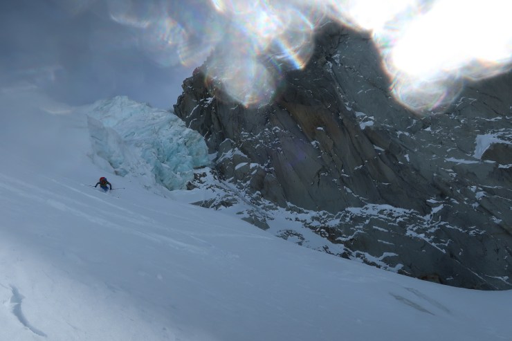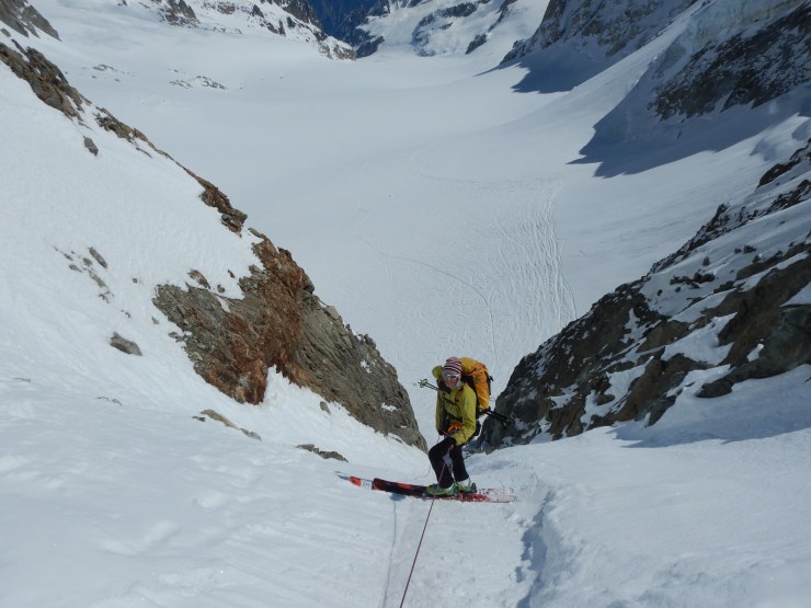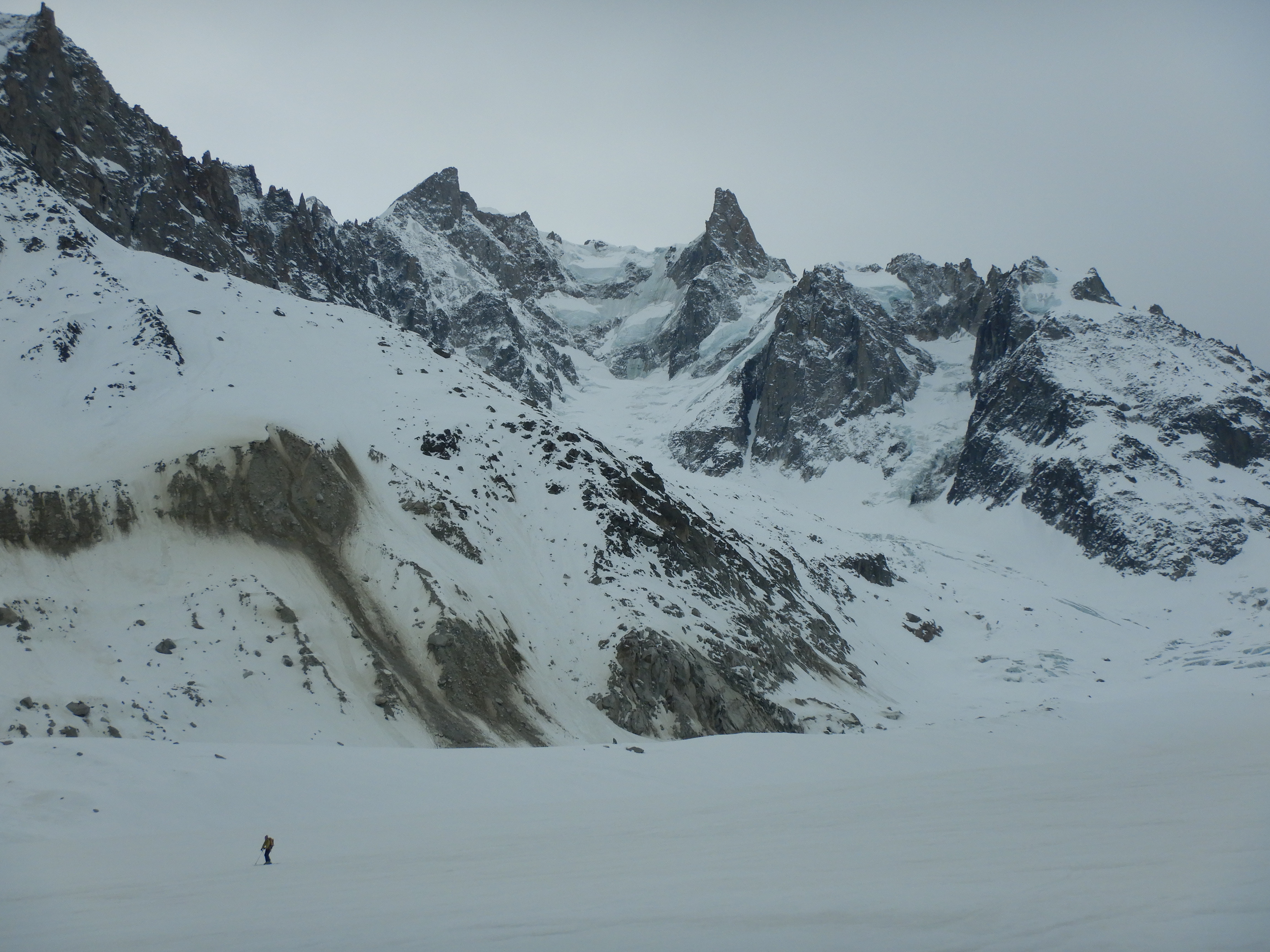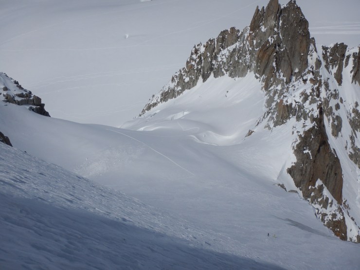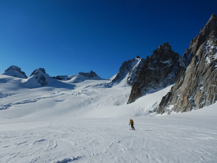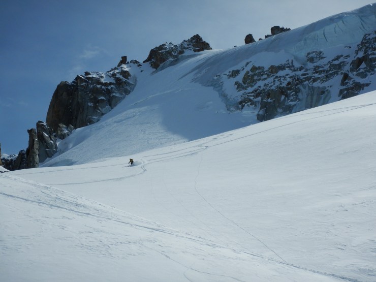 Wir starten die Abfahrt Richtung Vallée Blanche, welche mit Abstand eine unserer schlechtesten Abfahrten dieser Wintersaison darstellte 😉 Oben diffuses Licht mit sehr schnell wechselnder schlechter Schneequalität und unten meist betonhart oder sogar Blankeis. Die schweren Rucksäcke mit Kletter- und Skiausrüstung, Kocher, Essen und Notbiwakausrüstung machen’s uns nicht leichter auf dieser Buckelpiste.