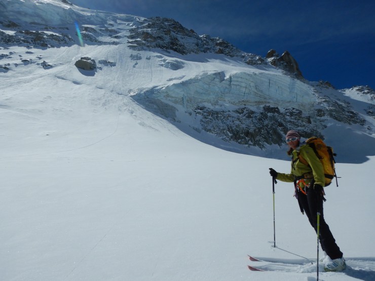 Weiter gehen wir direkt die steile Flanke links vom nächsten Sérac hoch, bis es keinen Sinn mehr hat, da die Unterlage mit Skiern in dieser Steilheit einfach zu hart wird. Wir machen ein Skidepot und gehen nur mit unseren Steigeisen, Pickel und einem Stock weiter.