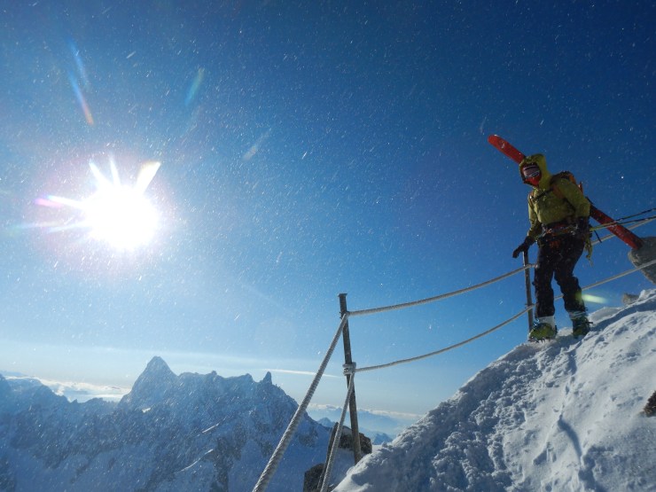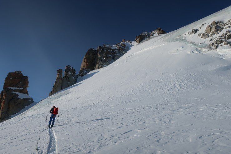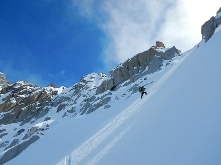 Mit der 1. Bahn fuhren wir auf die Aiguille du Midi. Hier erwartete uns der Föhnsturm bereits und schon beim Tunnelausgang der Bahn hatten wir sämtliche Kleidung an, die wir dabei hatten. Die gut präparierte Spur gings runter in die Fläche und von da an mit Skis in Richtung Vallée Blanche. Beim Abzweiger ins Gletscherbecken unter der Tour Ronde montieren wir wieder die Felle und steigen gemütlich hoch bis zum Skidepot vom Normalweg der Tour Ronde. Hier wechseln wir auf Steigeisen und spuren mal wieder zu Fuss weiter.