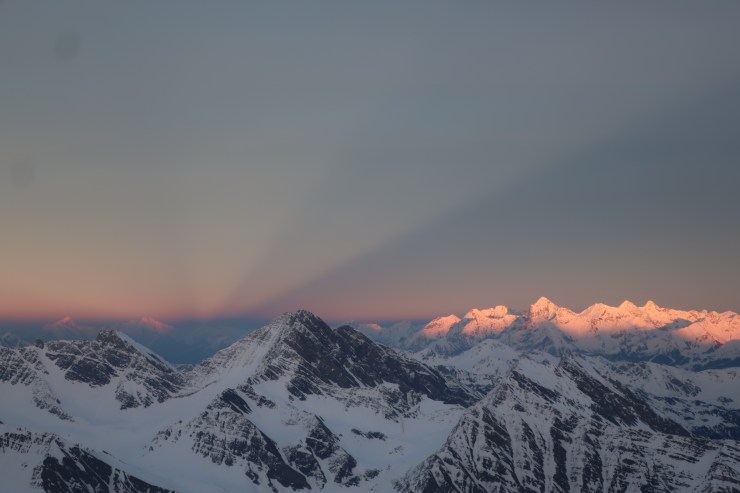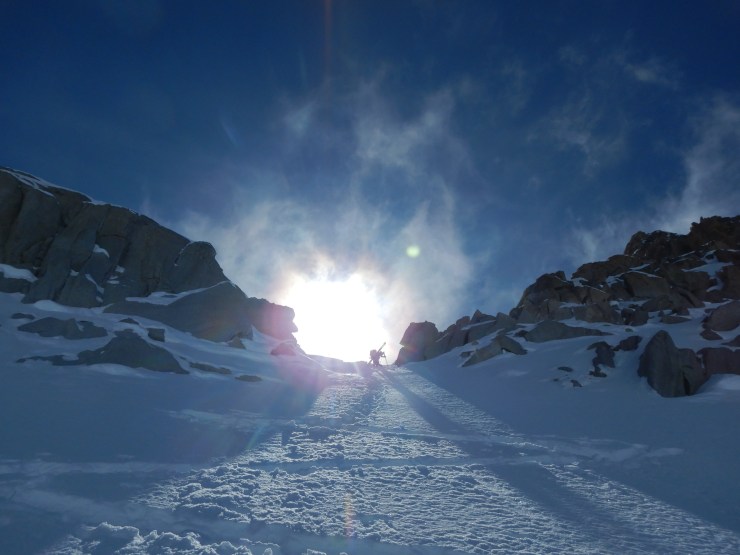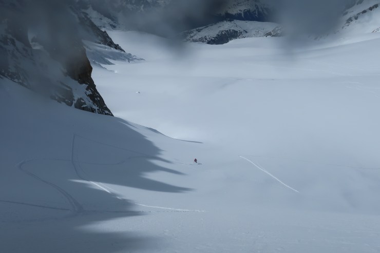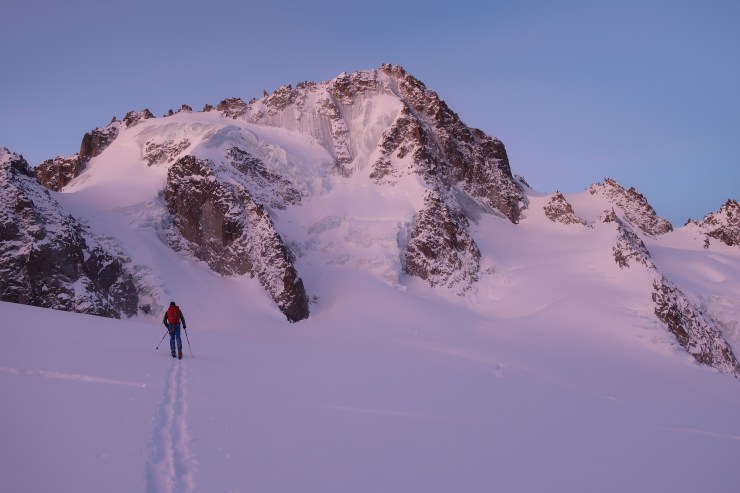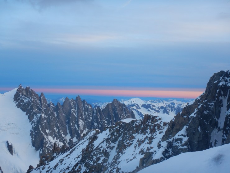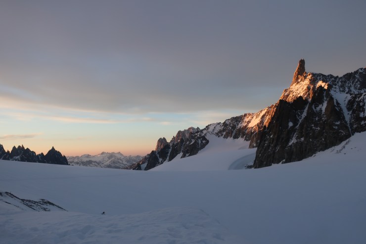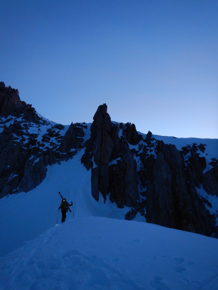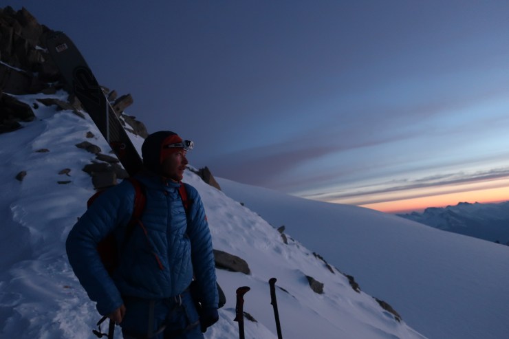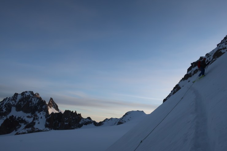Um 5:00 gehen wir unter der Hütte auf dem Gletscher noch in totaler Dunkelheit richtung Col du Tour los. Pünktlich als es etwas dämmert stehen wir oben auf der Scharte und schnallen Steigeisen an und Skier auf den Rücken. Auf der anderen Seite geht es etwas steil und schmal im Schnee und einer kurzen Felspassage einige dutzend Meter runter. Als wir wieder eine kurze Abfahrt starten (bei welcher man am besten einfach hoch quert um nicht zu viel Höhe zu verlieren), können wir die Stirnlampen ausschalten.
