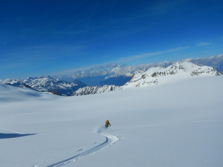 Nach zurückkehren zum Skidepot fahren wir in perfektem Schnee mit blauem Himmel runter zur Cabane du Trient, die wir um ca 17:00 Uhr 8 Stunden nach unserem Start erreichen.