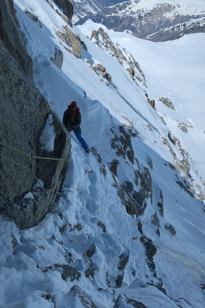 Ihr ist sehr kalt, wie ich es selten bei jemandem erlebt habe (Wir vermuten, dass es von der Übermüdung kommt). Wir sind uns einig, dass wir den Abstieg starten sollten, da dieser in diesem doch ziemlich anspruchsvollen Gelände in Skischuhen und Steigeisen doch einiges an Zeit und Energie kosten wird, da alles wieder retour und hoch und runter geklettert werden will.