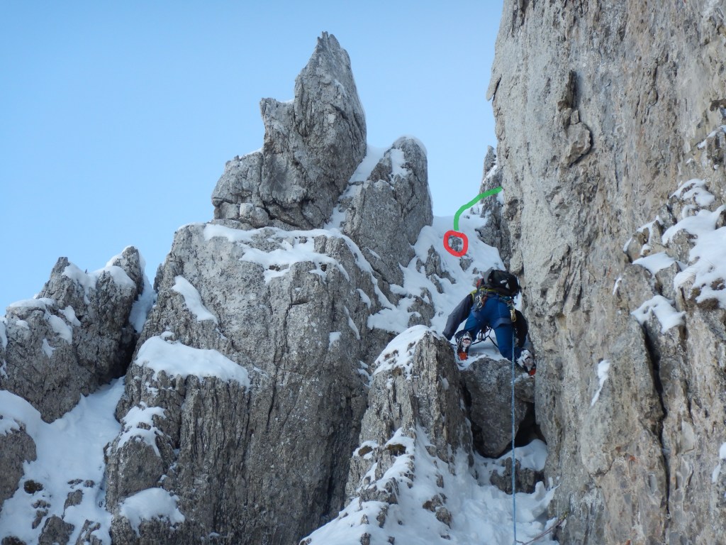 Am Grat angelangt geht man zuerst diesem in flachem Gelände in richtung des 1. Aufschwungs. Etwa 10m neben der Gratkante kann man über eine Rampe aufsteigen und später am Felssporn links herum hoch bis zum Bolt auf der Höhe der flachen Rampe welche nach Links führt. (M3)