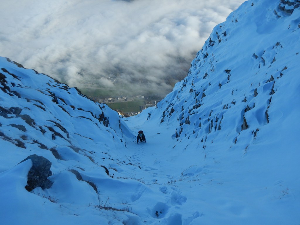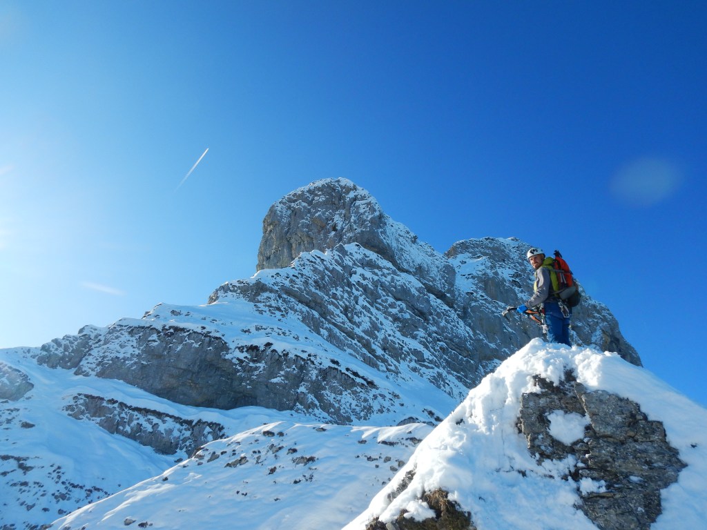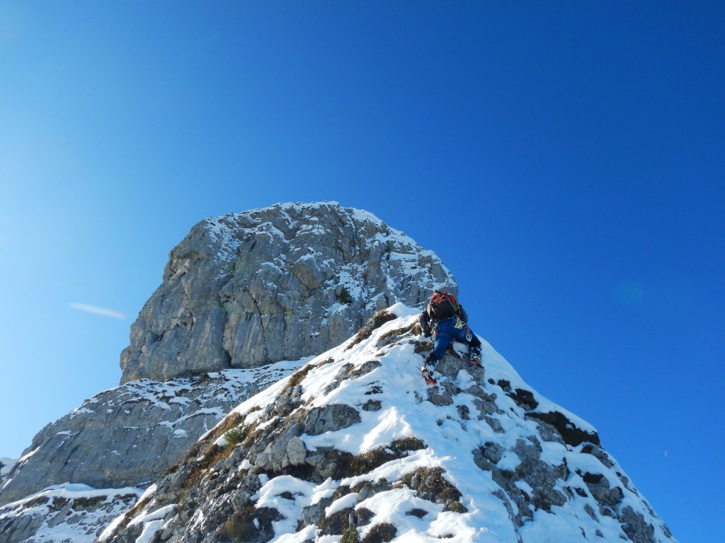 Im Sommer eine alpine Kletterei mit Kletterstellen bis 5a ist diese Route bei winterlichen Verhältnissen ein richtig cooles Abenteuer vor der Haustüre.