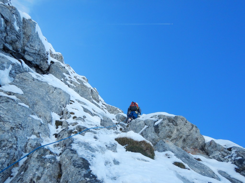 Wir sind alle Graspassagen und einfacheren Abschnitte Seilfrei gegangen, da ein Absichern weder für Vorsteiger noch Nachsteiger sinnvoll möglich gewesen wäre und dabei sehr viel Zeit verloren ginge, wenn man irgendwas mit dem kurzen Seil versuchen würde.