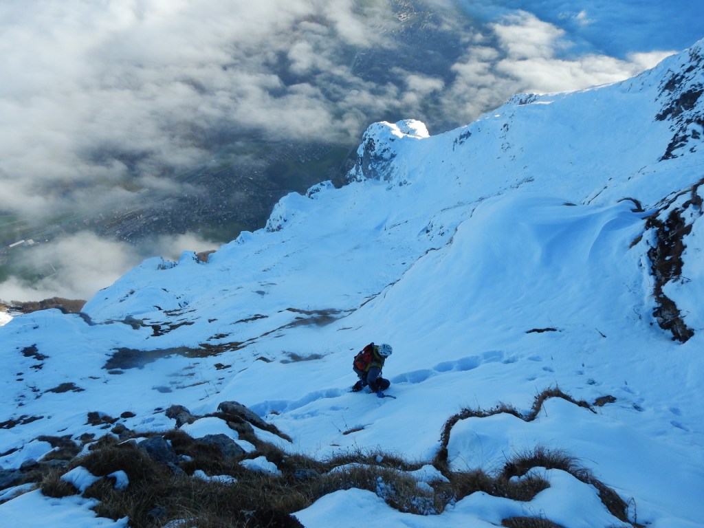 Für den Abstieg gibt’s einen Wanderweg. Das Problem bei den Verhältnissen ist, dass man die Spuren nicht sieht und die Markierungen nur ab und zu. Ohne Spuren ist es schwerstens zu empfehlen, dass man die obersten 700hm noch mit Licht absteigt. Bei Nebel oder Dunkelheit ohne Spuren muss man dann wohl mit GPS absteigen und vorsichtig unterwegs sein, da ein Sturz in diesem Gelände schlimme folgen haben würde.
