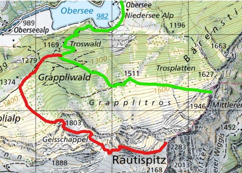 Los geht’s mit meinem guten Kumpel Martin um ca 7:15 Uhr beim Parkplatz beim Obersee. Der Zustieg via Wanderweg und wegloses Gelände führt uns wie folgt zum Einstieg am Grat: