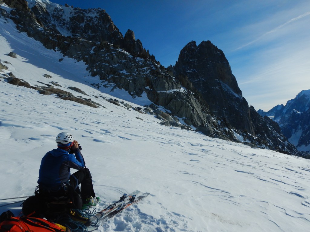 Da die Grand Montets Bahn nicht mehr läuft, weil die Station gebrannt hat, gingen wir vom höchst möglichen Sessellift mit Biwakmaterial, Essen und Kletterausrüstung mit den Skiern zur Bergstation der Grand Montets. Die Verhältnisse für den Aufstieg können wohl nicht viel schlechter sein mit fast eisig-hartem Schnee und Steinschlag aus dem Felsriegel unterhalb der Station. Wir kommen dafür durch das Adrenalin gepusht ziemlich gut voran.