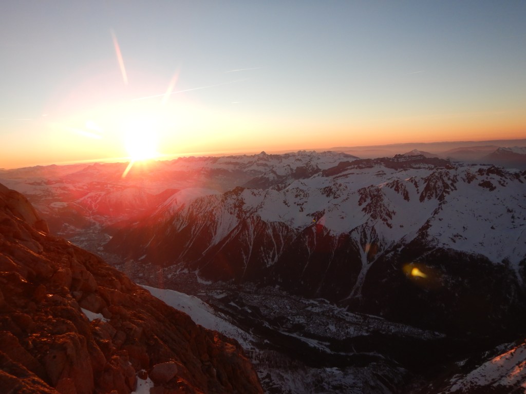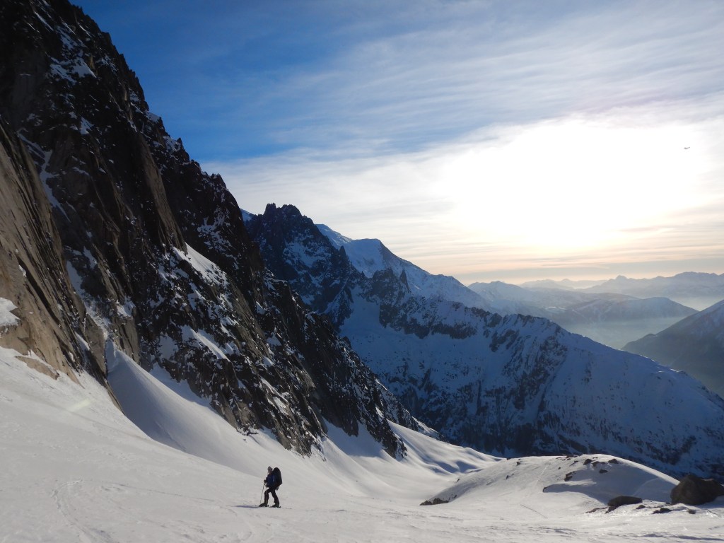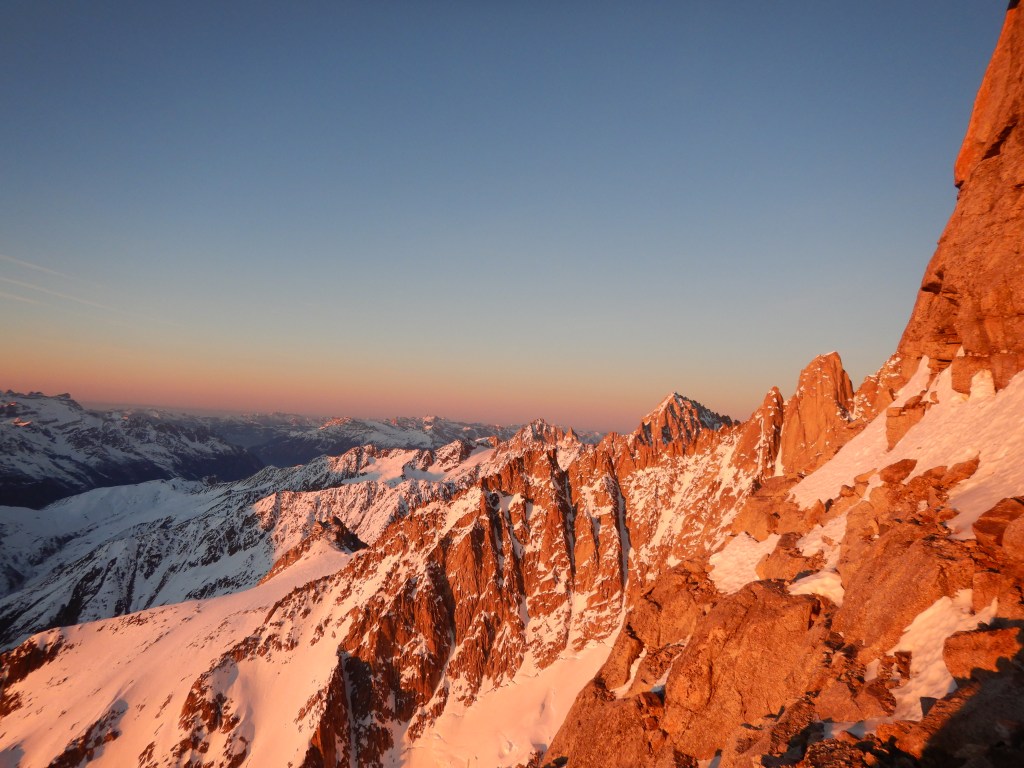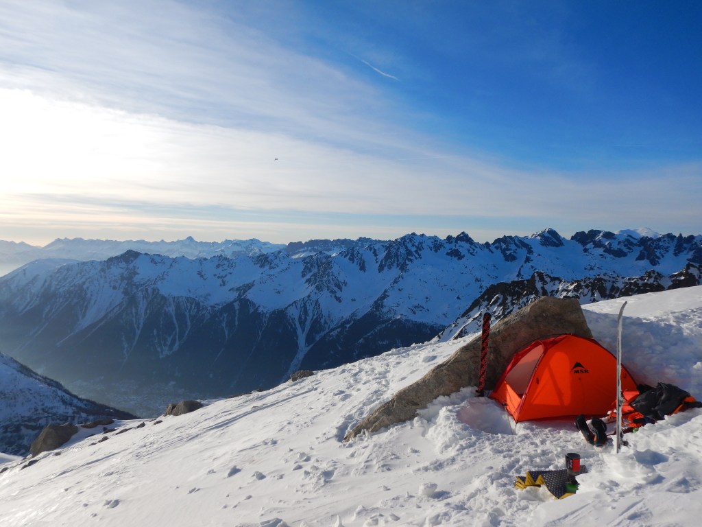 Zurück beim Zelt beschliessen wir entgegen des Plans, am nächsten Tag abzusteigen, direkt alles zusammen zu packen und in Chamonix gebührend die Begehung zu feiern. Hier und da im Abstieg kamen noch kleinere und grössere Probleme in den Weg, welche einen Abstieg durch steinschlägige Moränen, eine dämmernde Abfahrt über den uns unbekannten Gletscher (Mer de Glace) und ein ankommen bei Dunkelheit im Tal einschliesst.