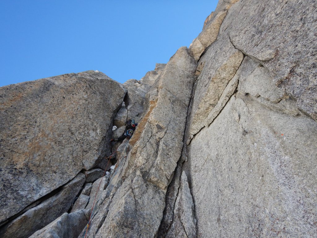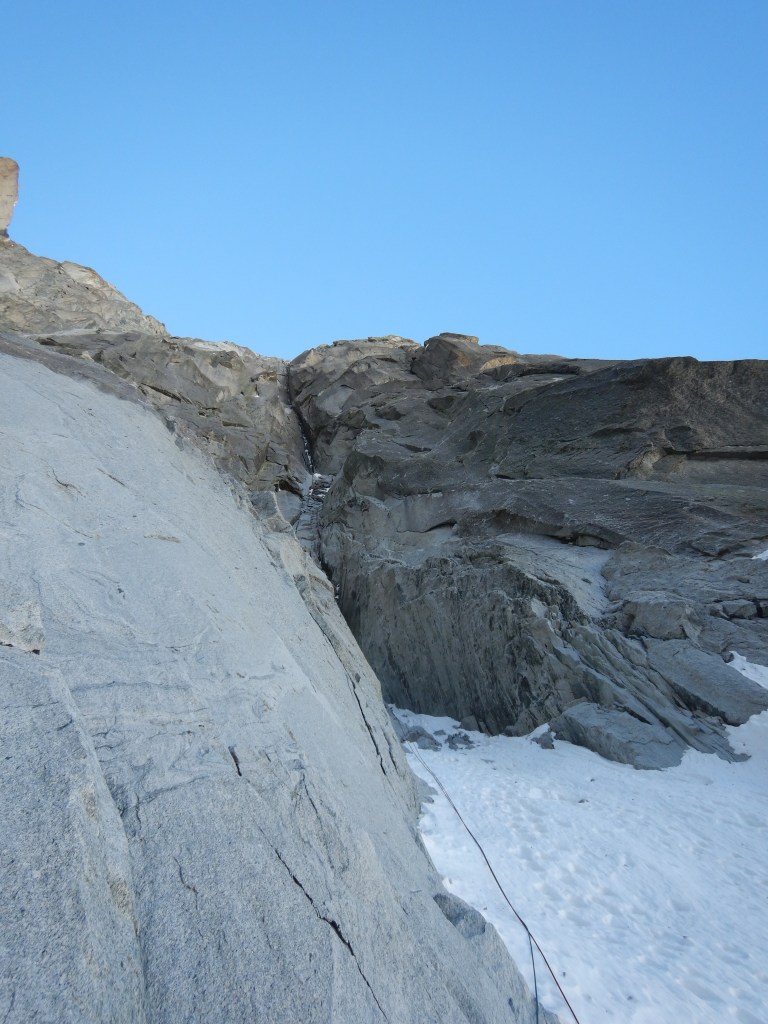 Hier wartet bereits die erste Schlüsselstelle denn über den ca 1m breiten Bergschrund an den Fels muss man ziemlich kühn, mit den Eisgeräten in feinsten Rissen verklemmt, die ersten 5m direkt über dem Bergschrund ohne wirklich gescheite Absicherung hinter sich bringen. nach ca 30m finde ich einen geeigneten Ort und sichere Noah nach. Den Rest des Vorbaus absolvieren wir gemeinsam am gestreckten Seil ohne grössere Probleme. Im 1. Schneefeld stapfen wir an die obere rechte Ecke wo der logische Weg weitergeht. Noah übernimmt hier den Vorstieg und wir steigen gemütlich dahin, zuerst noch simultan, bis wir an die schwierigeren Passagen vom Offwidth-Riss und Lambert-Riss gelangen. Noah übernimmt die Drecksarbeit vom Hochschrubben durch den Kamin, ich führe dafür die schwierigeren (laut Topo) Seillängen danach. Um kurz nach Mittag steigen wir beim nächsten Schneefeld ganz nach rechts auf die Kante hoch, hier hat es mehrere Biwakplätze, welche wir aber nicht benutzen werden, da wir noch zu früh dran sind. Dafür gönnen wir uns hier die 1. richtige Pause seit dem frühen Start um 6:00.