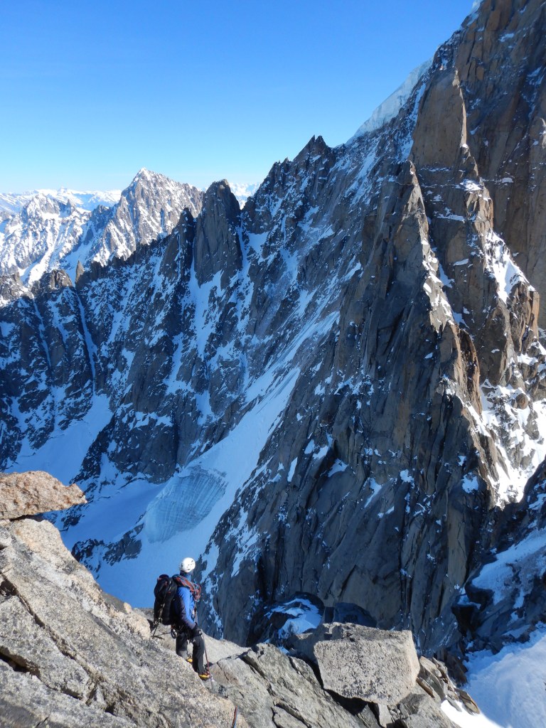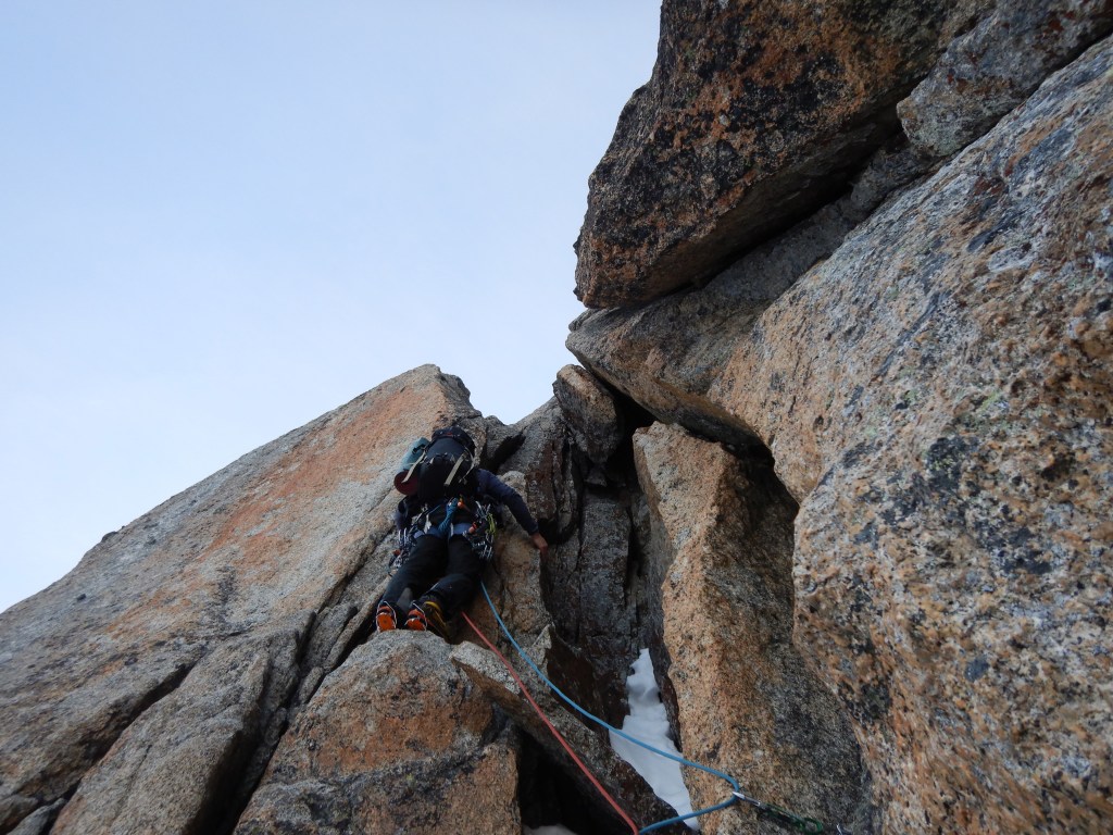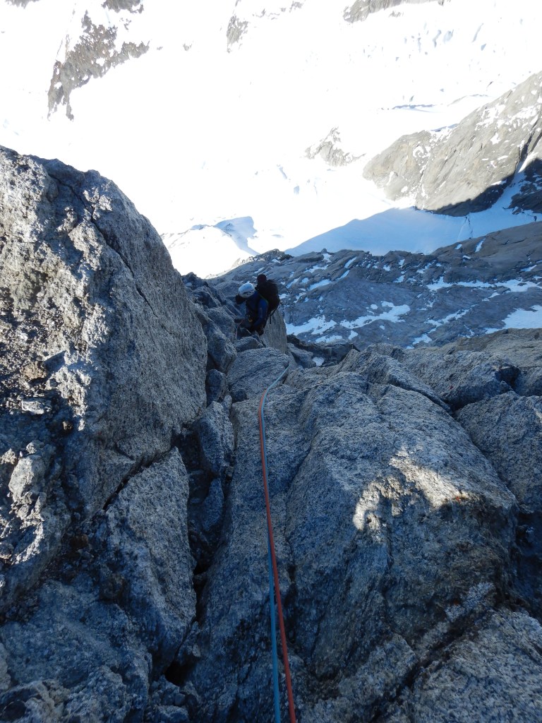 Wir sind beide schon ziemlich „gebraucht“ da die Kletterei ein gehen ohne Steigeisen durch gelegentliche Schnee und Eisauflage nicht zulässt und die schwierigeren Felsstellen dann doch meist trocken waren und mit Steigeisen schon ziemlich anspruchsvoll zu klettern waren.