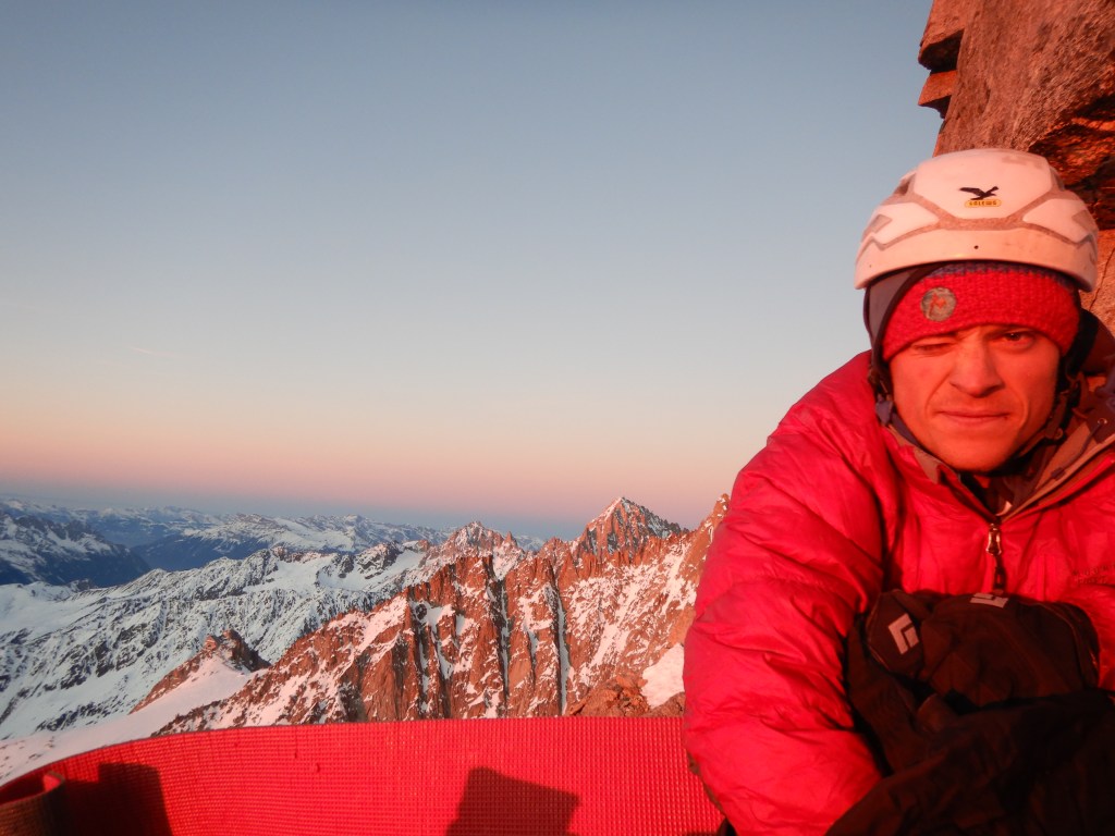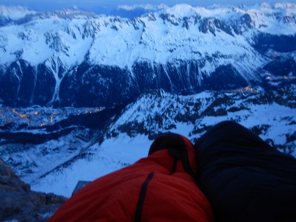 Durch die Unannehmlichkeiten der Situation und Temperaturen haben weder ich noch Noah Lust noch mehr Wasser zu kochen (wir waren ca. 11h Nonstop kletternd unterwegs). Wir haben jeweils gesamthaft etwa 1.5l Wasser getrunken. Der Kocher verschwindet im Schlafsack, sodass Gas und Brenner über Nacht nicht einfrieren. Meine Beine hängen über dem Abgrund und der Rücken liegt am 55° steilen Hang. Noah hat seine Füsse auf einem Stein aufgelegt und liegt direkt an meiner Schulter auch am Hang. Unglaublich wie selbstverständlich wir uns in dieser doch ziemlich erdrückenden Situation hergerichtet hatten.
