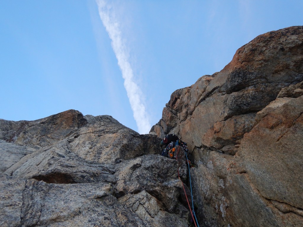 Weiter geht’s wieder kurz abkletternd zurück in die offensichtlichen Kamine/Risse welche in Aufstiegsrichtung links vom Grat den Weg weiter nach oben weisen.
