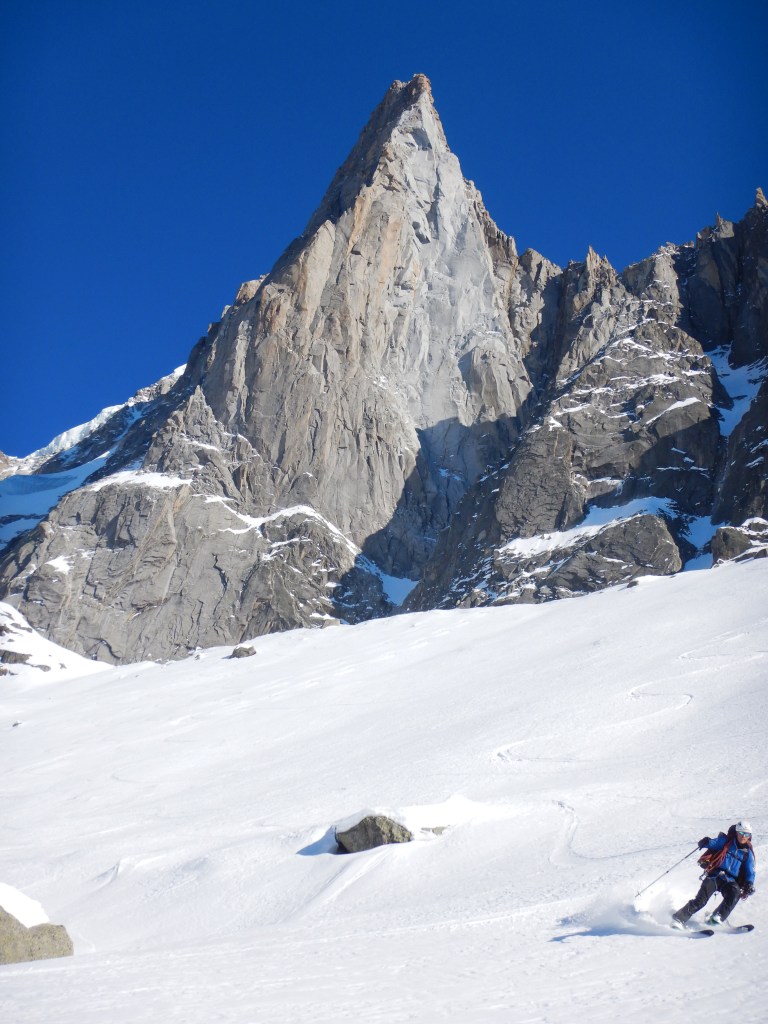 Abfahrt mit schweren Rucksäcken und Beinen unterhalb der Petit Dru