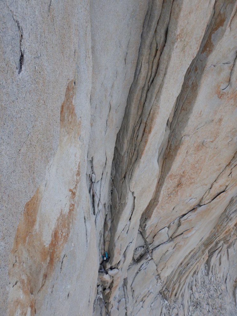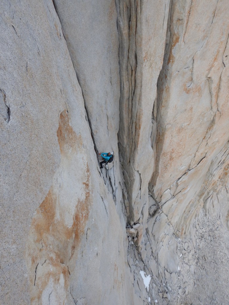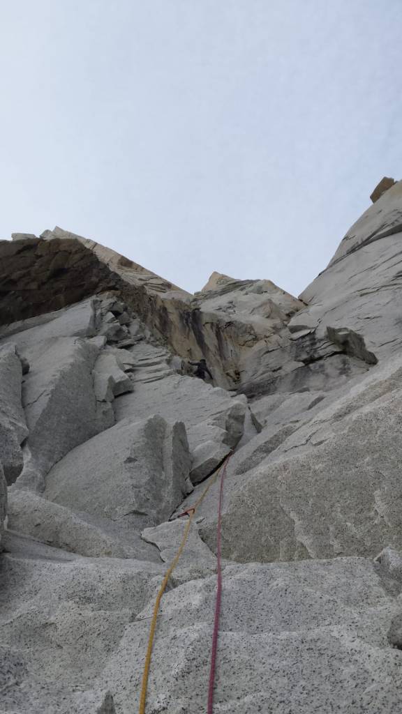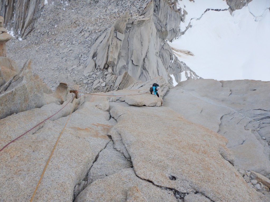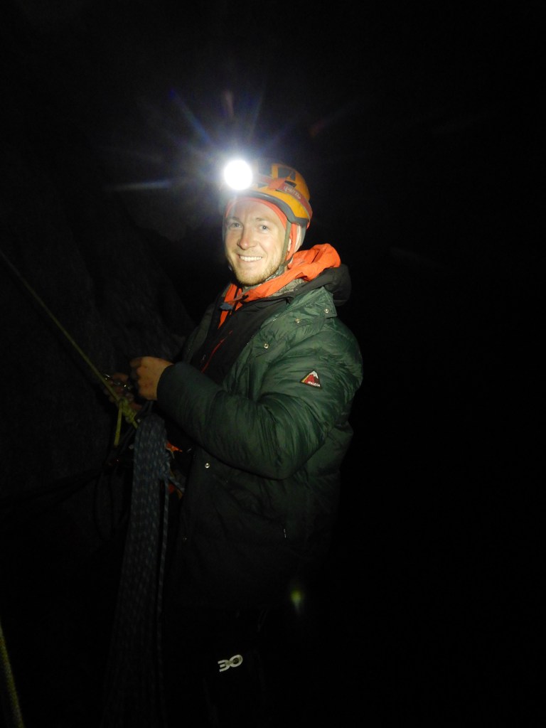 Wir kommen um 3:15 Uhr am 1. Standplatz an und machen uns bereit zum Klettern. Wir wollen die geneigte Rampe zusammen am gestreckten Seil klettern und die beiden Schlüssellängen an deren Ende dann durchsichern. Alles läuft super, perfekte Verhältnisse also ziemlich einfach zu gehen. Sooo cool sich in diesem Gelände so agil bewegen zu können, ich bereue keine Minute vom harten Training zu Hause.