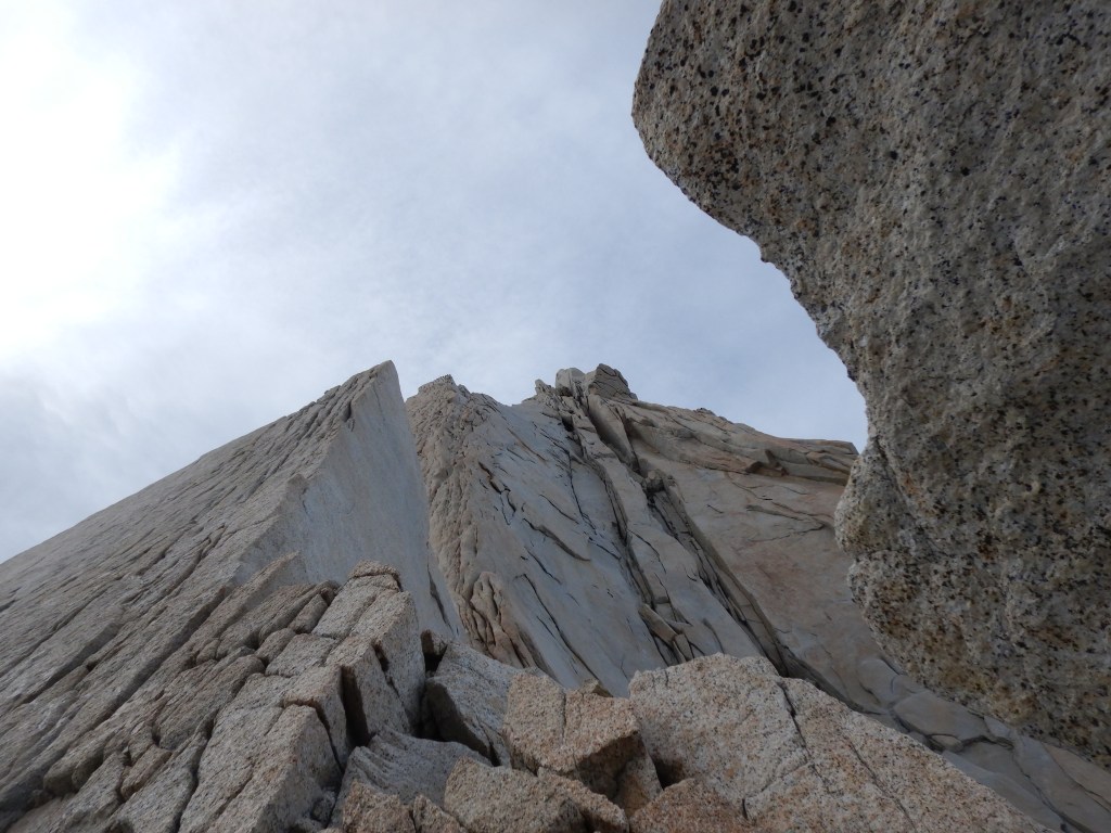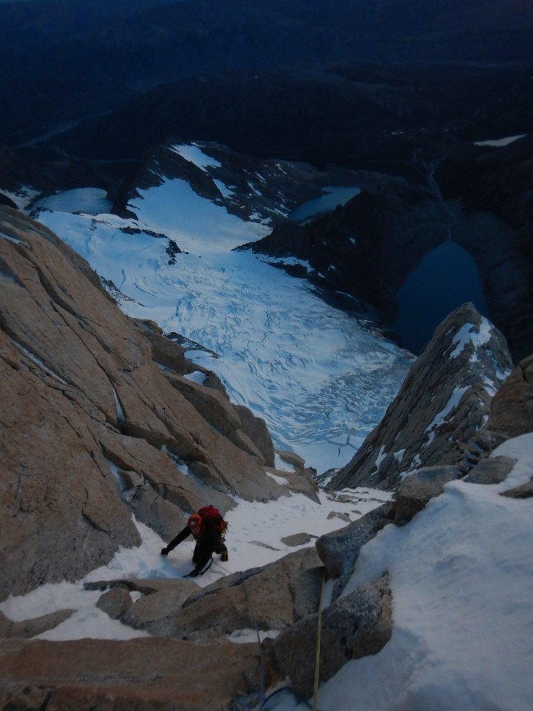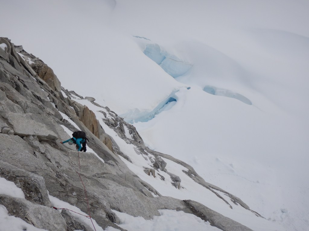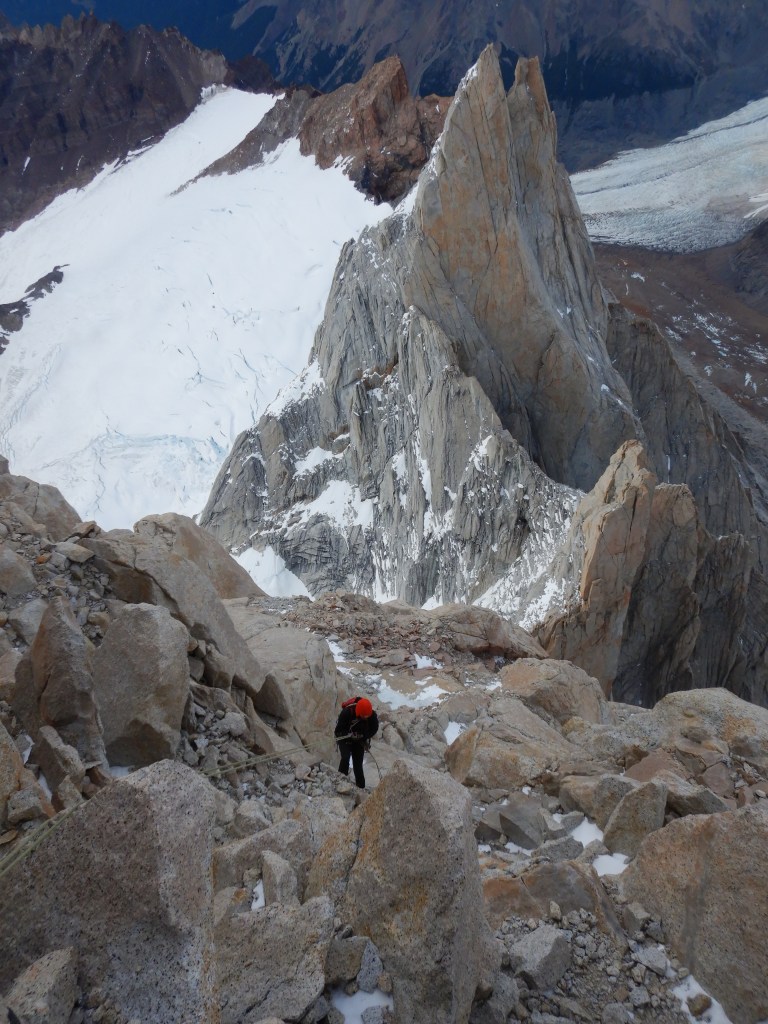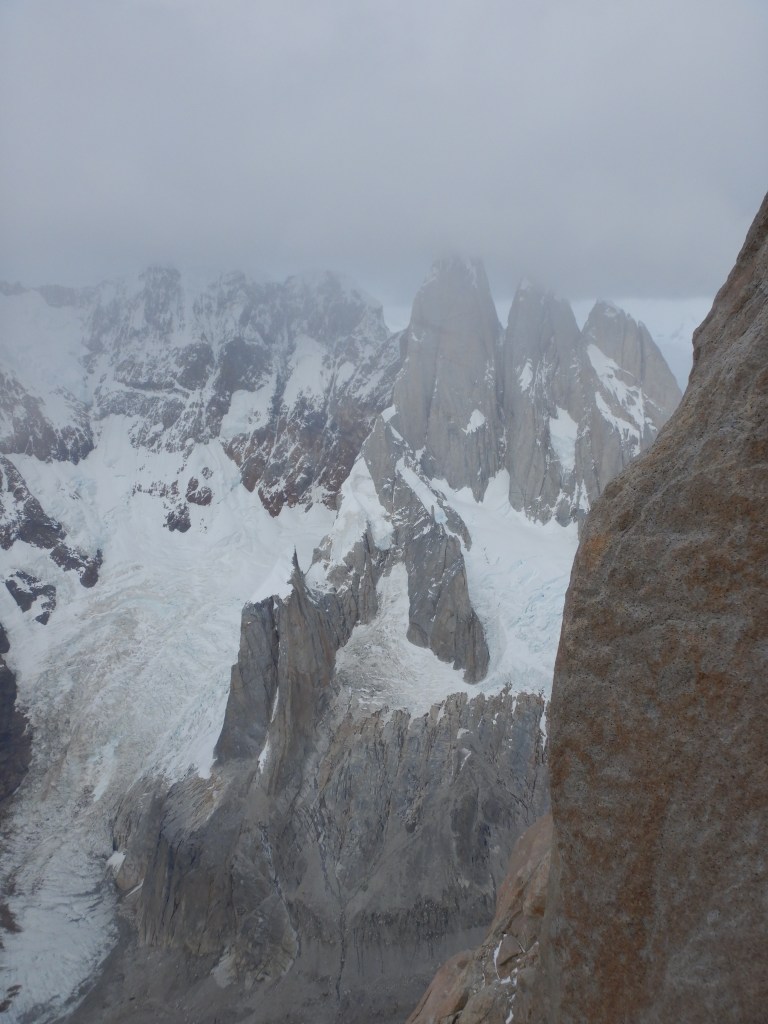 Jetzt wirds unangenehm, da die Wolken vom Cerro Torre zu uns kamen wie ein Schnellzug und uns der Wind und die Niederschläge mit voller Wucht trafen. An diesem Ort in solch Wetter zu geraten kann man sich nur ein bisschen vorstellen, denn es ändert sich alles, wenn man dann wirklich mal so weit ist und es miterlebt. Wir seilen mit nur einem Halbseil ab, da uns der Wind sonst die Seile irgendwo in den Blöcken oder Rissen verklemmen würden. Alles läuft super, wir sind speditiv und finden sofort Standplätze und den richtigen Abzweiger zur Schulter zurück in die Rampe auf der Ostseite. Endich, nach dem 1. Abseiler in der Rampe merken wir den Wind nicht mehr und es läuft alles perfekt zurück bis zum Gletscher, es ist 11:00 Uhr.