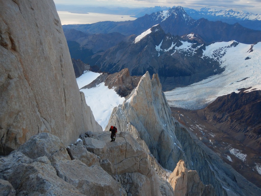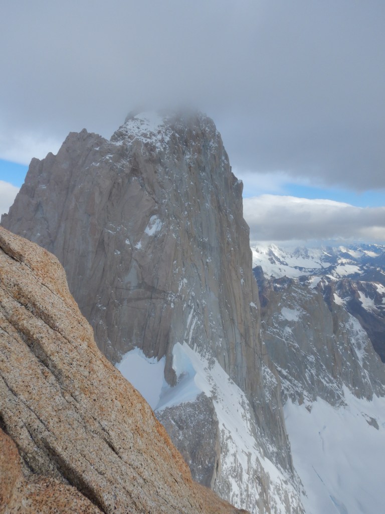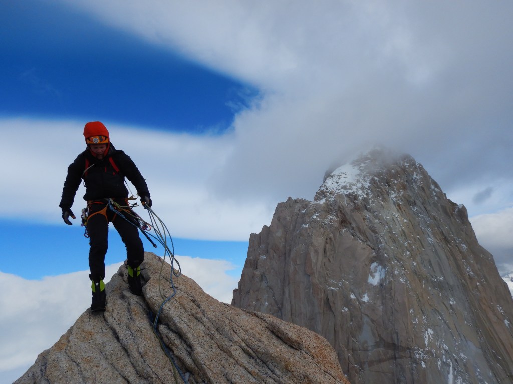 1 Seillänge später steige ich bereits am Gipfel aus. Das ging jetzt aber schnell. Ich sichere Phil nach und wir setzen uns ein wenig in die Ostseite des Gipfels und machen eine kurze Pause. Es ist 8:00 Uhr morgens. Der Wind ist stark und am Fitz Roy hat es bereits Wolken um den Gipfel. Auch am Cerro Torre drücken bereits die Wolken drüber.