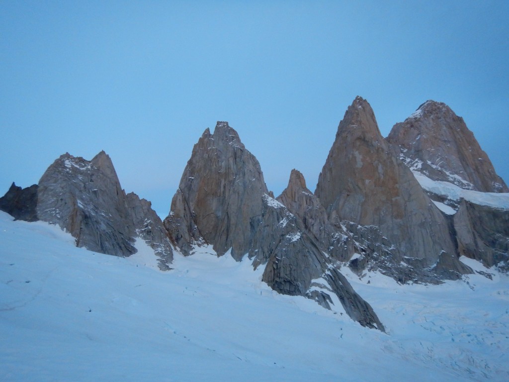 Um 23:00 geht der Wecker. Wir sind motiviert und das Wetter ist perfekt. Der Mond ist leider nicht da und es ist stockfinster. Um 23:30 gehen wir los auf dem Gletscher und es geht richtig locker Richtung Paso Superior nur mit der Kletterausrüstung. Hier ist auch bereits reges Treiben im Gange als wir um 1:30 vorbei kommen. Die Leute gehen alle Richtung Fitz Roy.