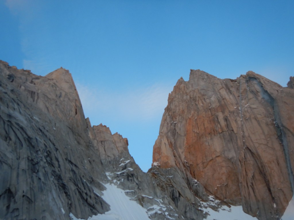 Die Schlüssellängen fliegen an uns vorbei, Phil steigt die erste vor und die 2. mache ich im Vorstieg. Viel einfacher als wir uns gedacht hatten. Als ich auf der Schulter des Berges Phil nachsichere geht die Sonne gerade erst auf. Es ist erst 6:00 und wir haben die stark verhältnisabhängige Rinne bereits hinter uns.