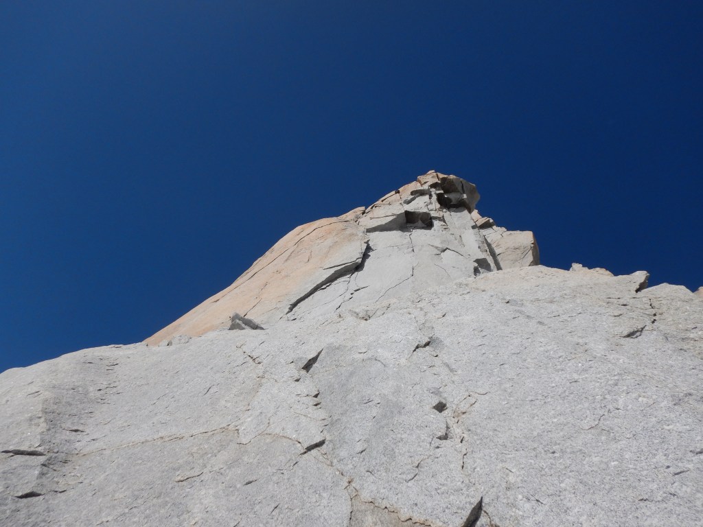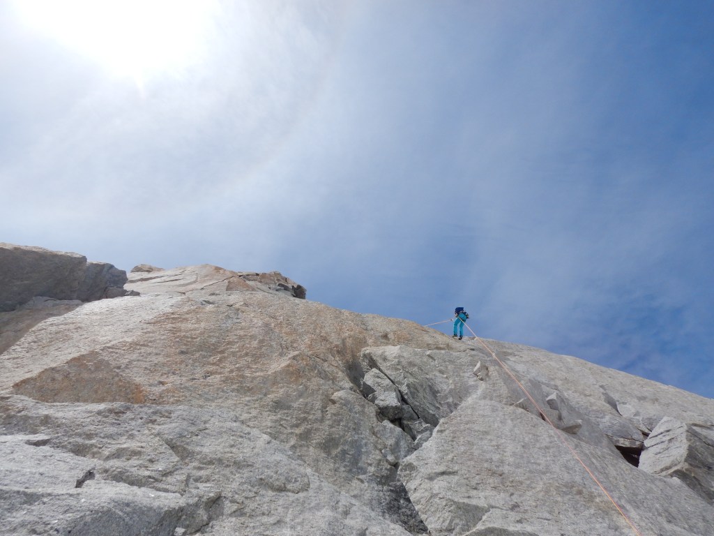 An die nächsten beiden Seillängen kann ich mich nur noch schemenhaft erinnern, da sie totale Genusskletterei mit logischer Linienführung bieteten. Perfekter Fels, gute Friends-Placements und super Wetter begleitete uns auf diesen Längen.