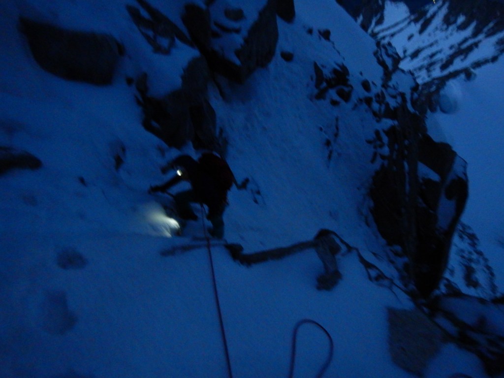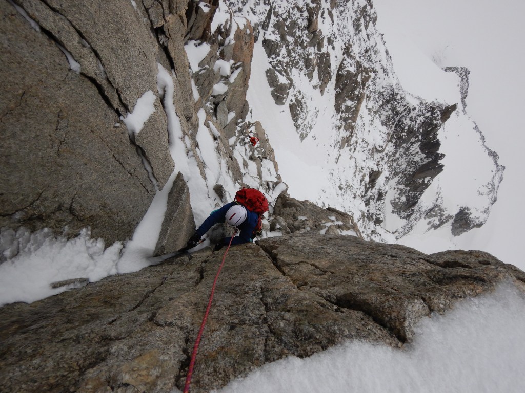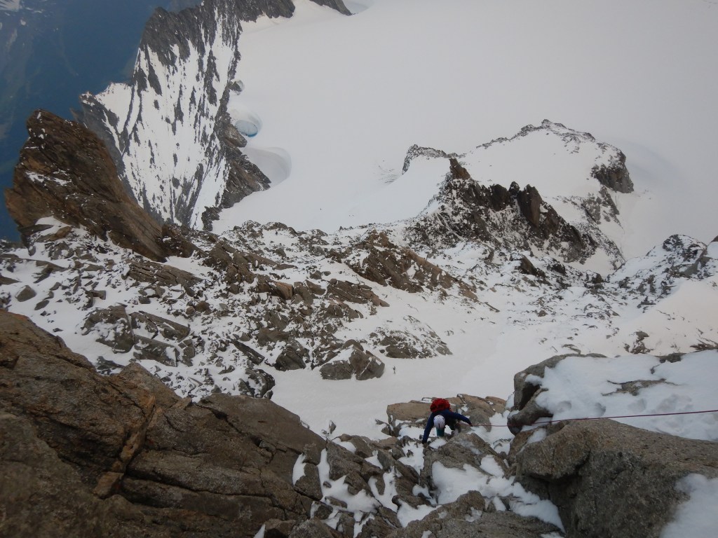Bei unserer Begehung hat’s durch Hitzegewitter am Abend noch ziemlich Schnee in den Felsteil gegeben und die Kletterei war in diesen Verhältnissen interessant und nicht zu unterschätzen. Vor allem der Vorsteiger sollte auch mit Steigeisen den 4. Grad sicher beherrschen!