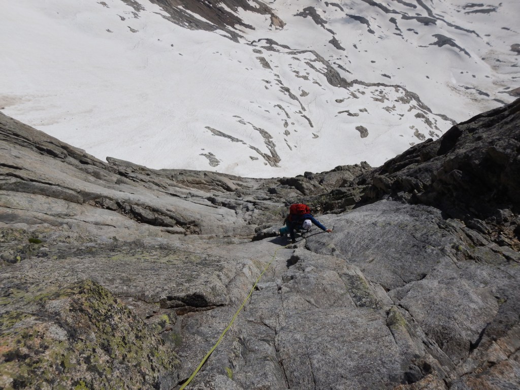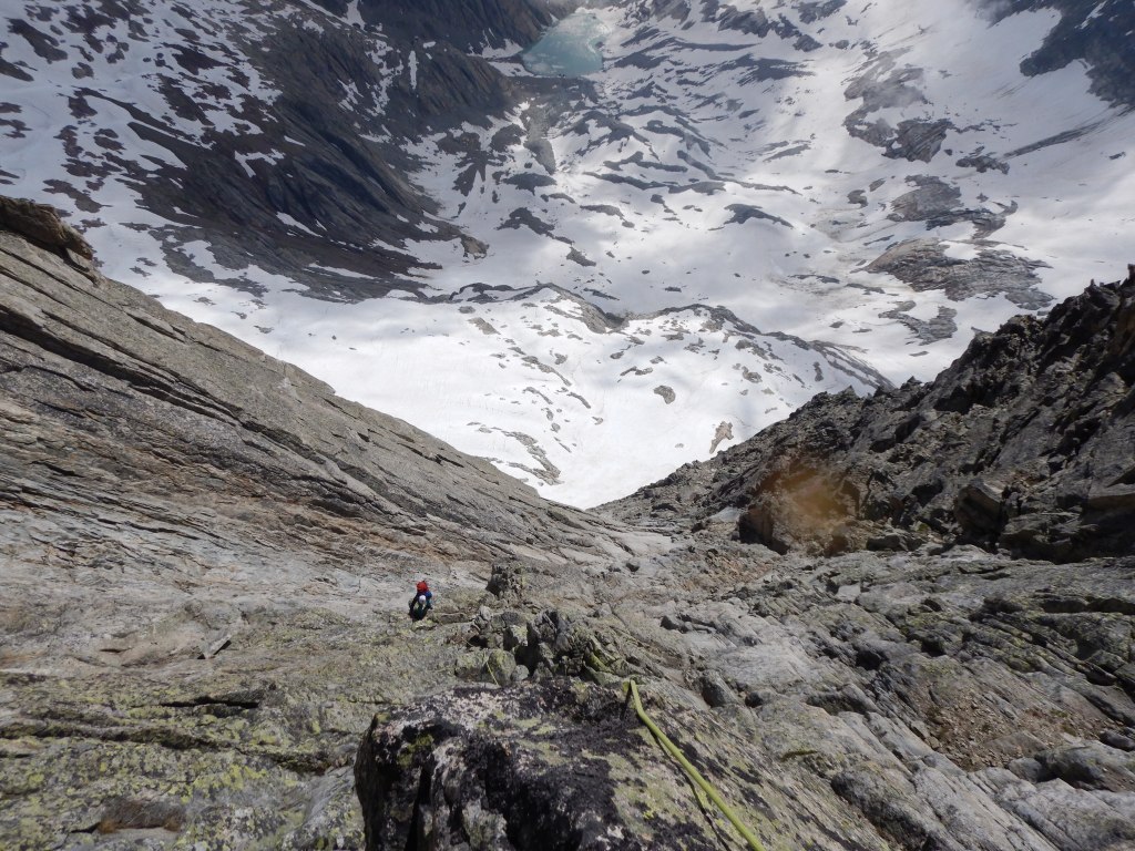 Der Abstieg vom Gipfel geht am einfachsten via Südgrat bis nach Osten die hoffentlich noch mit Schnee gefüllte Rinne auf den Gletscher weist. Die Felsen in dieser Rinne sind brüchig und sicher nicht angenehm abzusteigen wenn’s keinen Schnee mehr hat. Weiter sind wir abgestiegen via „Undri Bächlilicken“ zur Bächlitalhütte um am nächsten Tag noch den Diamantstock Ostgrat zu begehen, welcher auch sehr lohnend ist!