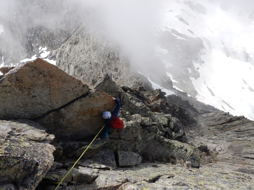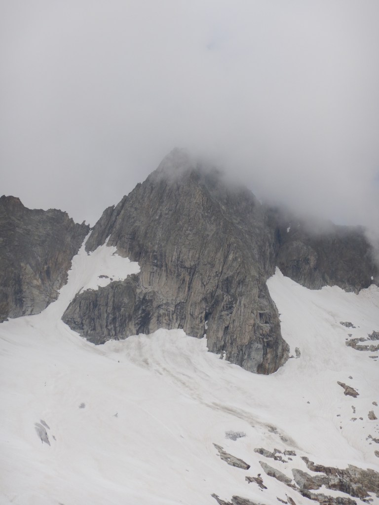 Gipfel ganz knapp nicht in Wolken, links runter Südgrat mit der Abstiegsrinne