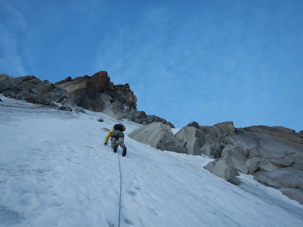 Am nächsten Morgen sind wir bereits um 6:00 Uhr losgegangen, um den Schnee noch schön fest geniessen zu können. Wir haben die Felsbastion oben rechts umgangen, da wir am Abend links rum die ganze Zeit Steinschlag feststellen konnten. Geklettert sind wir auch hier wieder alles simultan mit super Zwischensicherungen in Form von Eisschrauben. Wie vorher erwähnt, sind wir dann bereits um 8:00 Uhr ausgestiegen.