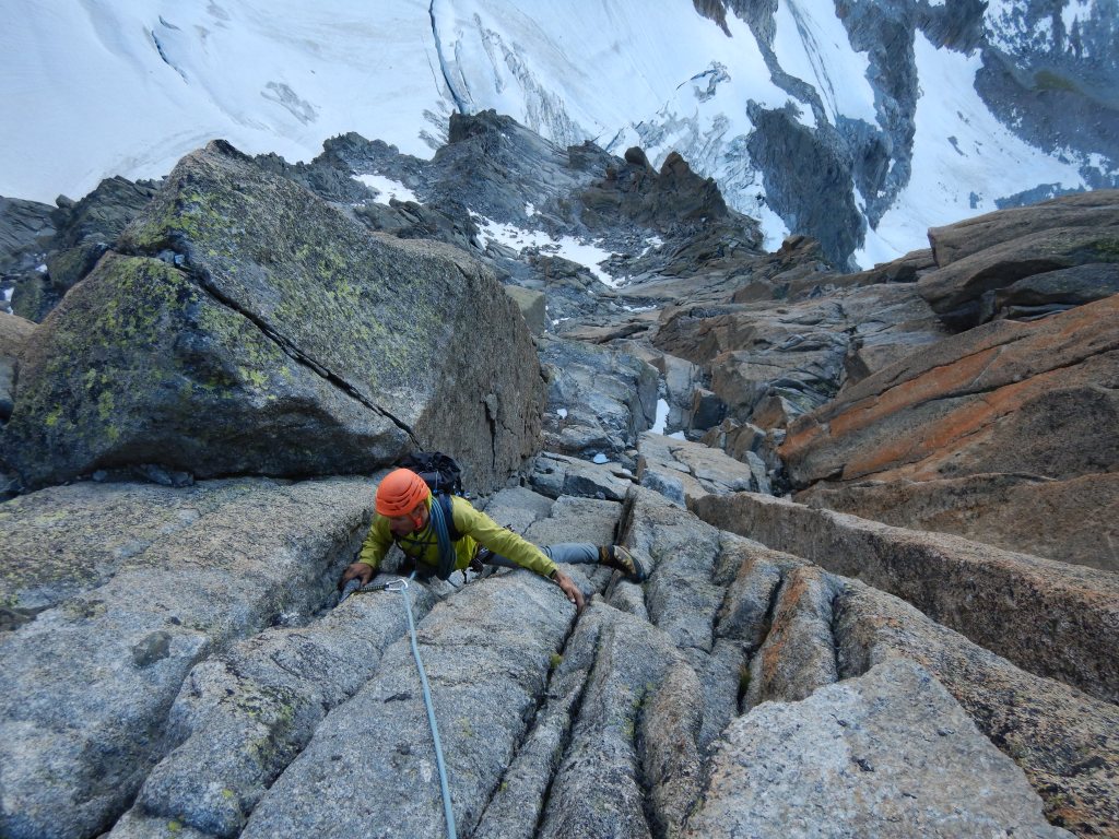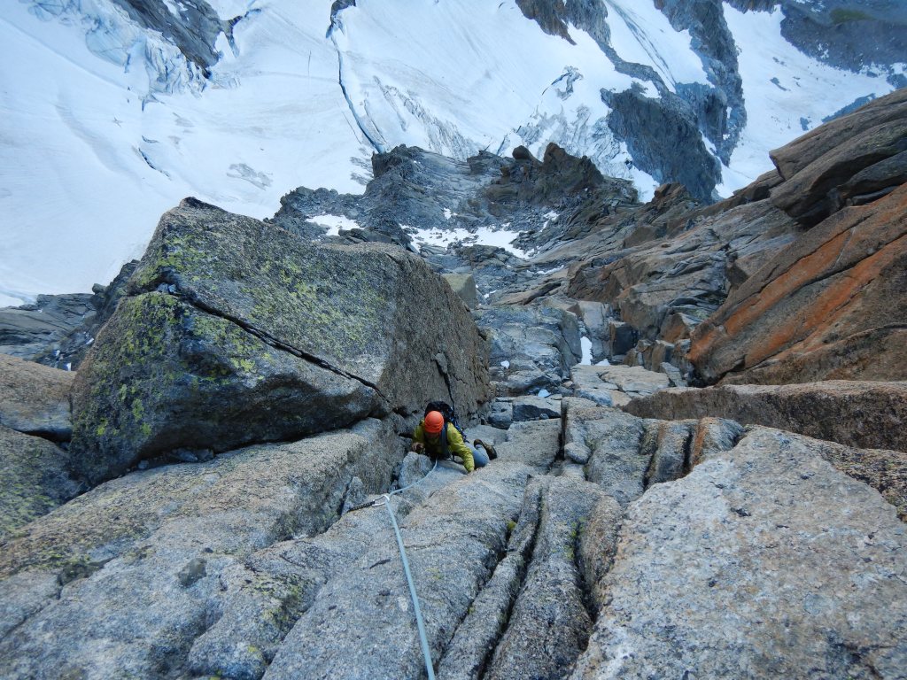 Von hier klettern wir ab zwischen die beiden Gipfel und zum Ende des Charmoz-Grépon Couloir und steigen Richtung Grépon wieder auf. Hier begehen wir einige Routenfindungsfehler und büssen locker 1h-2h Zeit ein mit verschiedensten falschen Abseilern und Wiederaufstiegen. Einmal zurück auf der richtigen Route (man muss weiter wieder hoch klettern Richtung Grépon, bevor man die Gratkante wechselt) und gehen dann ohne Probleme bis zur Schlüsselstelle der Tour: Dem Mummery-Crack, dieser ist laut Führern mit 5b bewertet, aber ich denke sogar 6b ist hier eher eine harte Bewertung. Ich kämpfe mich auf jeden Fall den Offwidth hoch und bin froh über die Schlaghaken (fix) und Friends, welche ich legen kann. Wir klettern ziemlich Freestyle, denn das ewige Gratwechseln hier und überqueren da geht uns auf die Nerven und wir gelangen eigentlich alles auf der Nordseite bleibend ohne grössere Probleme zum Gipfel. Es ist nun 13:00 Uhr und es zieht bereits zu. Wir verbrauchen keine unnötige Zeit und seilen 1 mal nach Süden und 1 mal nach Westen ab und klettern dann ab in Richtung „Col des Nantillons“.
