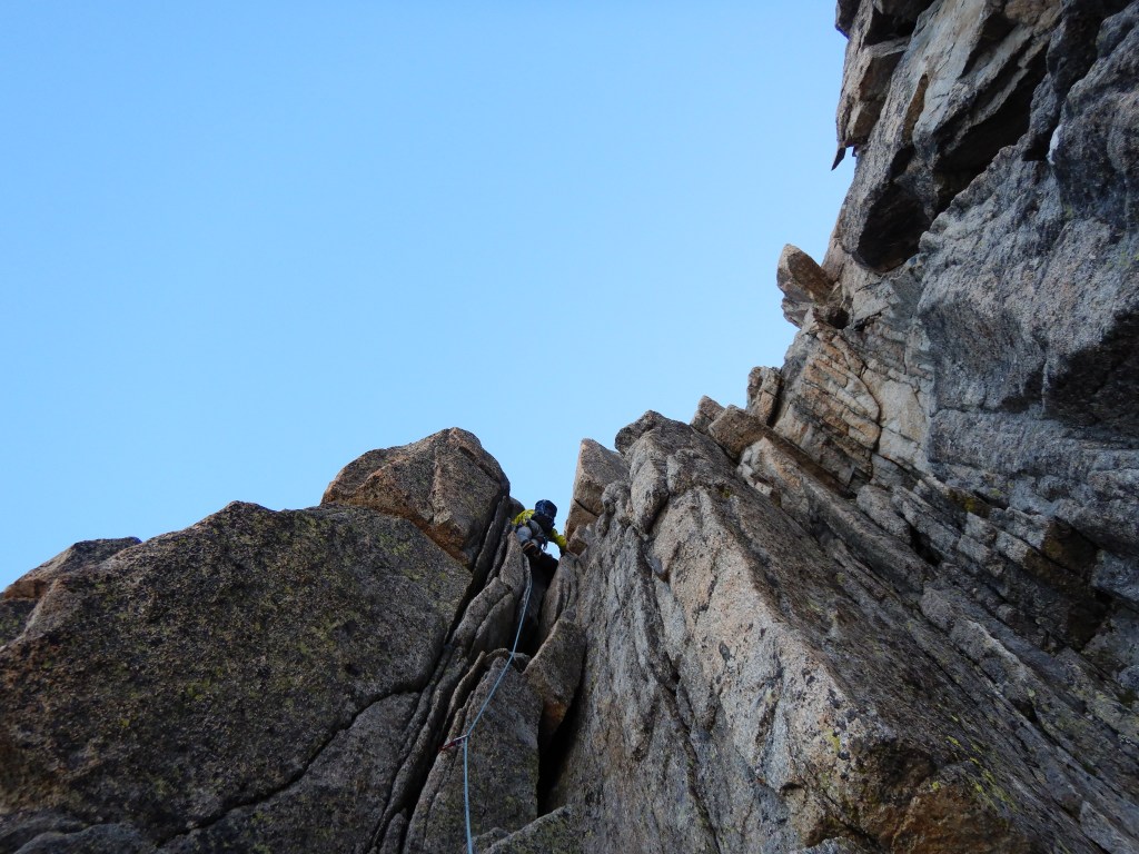 Zurück zu unserer Tour: Wir steigen ins Charmoz-Grépon Couloir ein und verfolgen dieses etwa 250-300m (100m zu weit) und traversieren dann nach links und treffen am Burgener Crack (III laut Führer, min. 5a mit normaler Bewertung) wieder auf die Route und klettern der logischen Linie nach bis zum Gipfel der Charmoz.