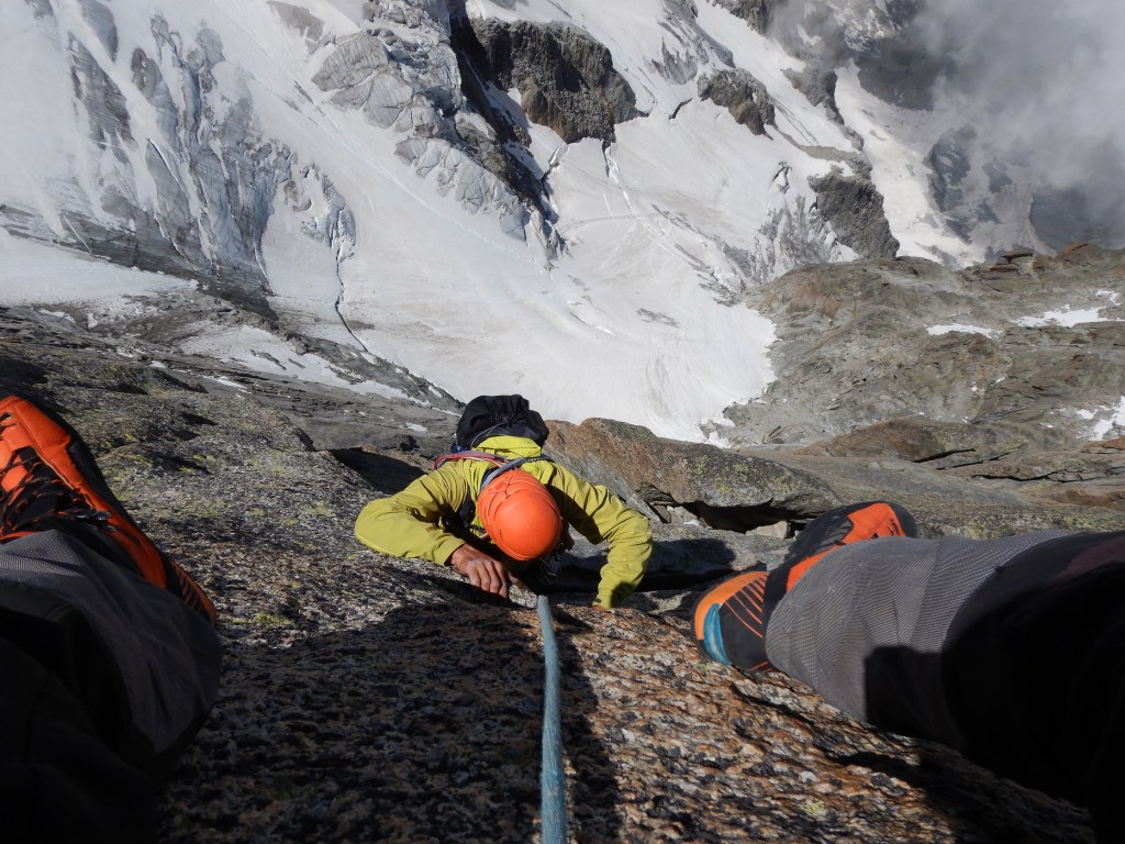 Die Kletterei ist schön, im Genussbereich, die beiden 5c-Stellen kann man entweder technisch bewältigen und sind nicht allzu schwer. Da wir erst um 14:00 eingestiegen sind haben wir doch einiges an Druck, da wir nicht wissen wie weit es ist und wie lange wir dafür brauchen werden. Wir rasen die Kletterei nur so durch, alles simultan kletternd. Um 18:00 erreichen wir bereits den Pfeilerkopf, wo der Felsteil vorbei ist, und nur noch der Schnee/Eisausstieg wartet. Der Schnee ist unterdessen schon durchnässt und wir sind uns sicher, dass unsere Entscheidung, hier zu biwakieren richtig ist. Wenn wir damals schon gewusst hätten, dass wir durch den oberen Teil nur noch 1.5.2h brauchen würden hätten wir’s wahrscheinlich noch an diesem Tag durchgezogen. Anyway, das Biwak war unglaublich mit einem der schönsten Sonnenuntergänge, welche ich jemals in den Bergen erlebt hatte.