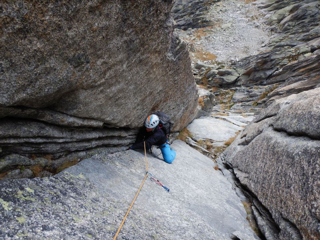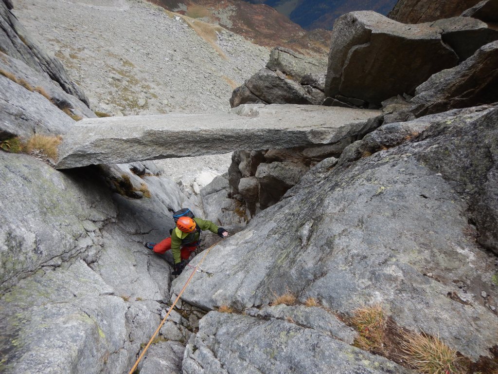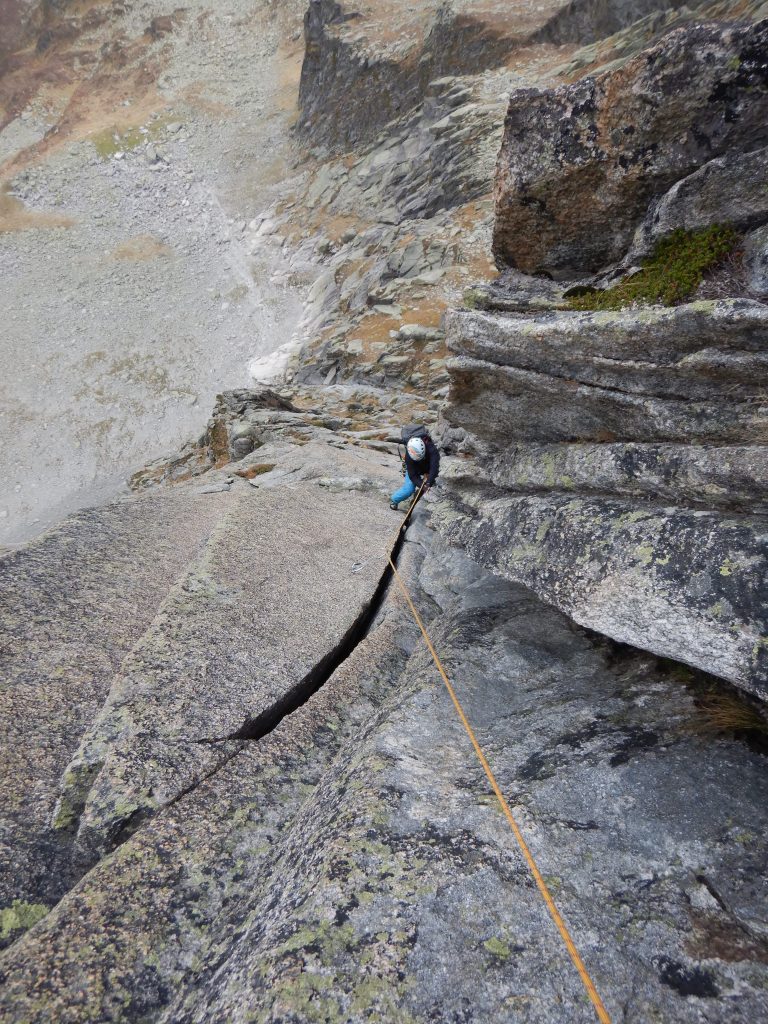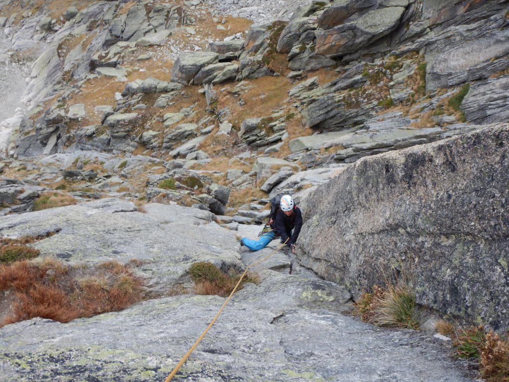 Naja, 2 mal Schütteln und weiter geht’s. Die nächsten Seillängen sind nicht allzu schwierig und um ein wenig Tempo zu machen, lasse ich Sämi jeweils Sylvia bis zum Stand nachsichern und ich klettere einfach die ersten paar dutzend Meter jeder Seillänge ohne Partnersicherung. (Dies ist nicht, wie man so eine Route begeht aber man muss sich immer den Verhältnissen und der eigenen Verfassung anpassen)