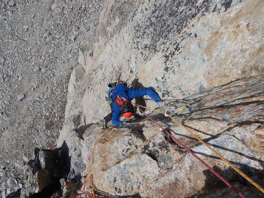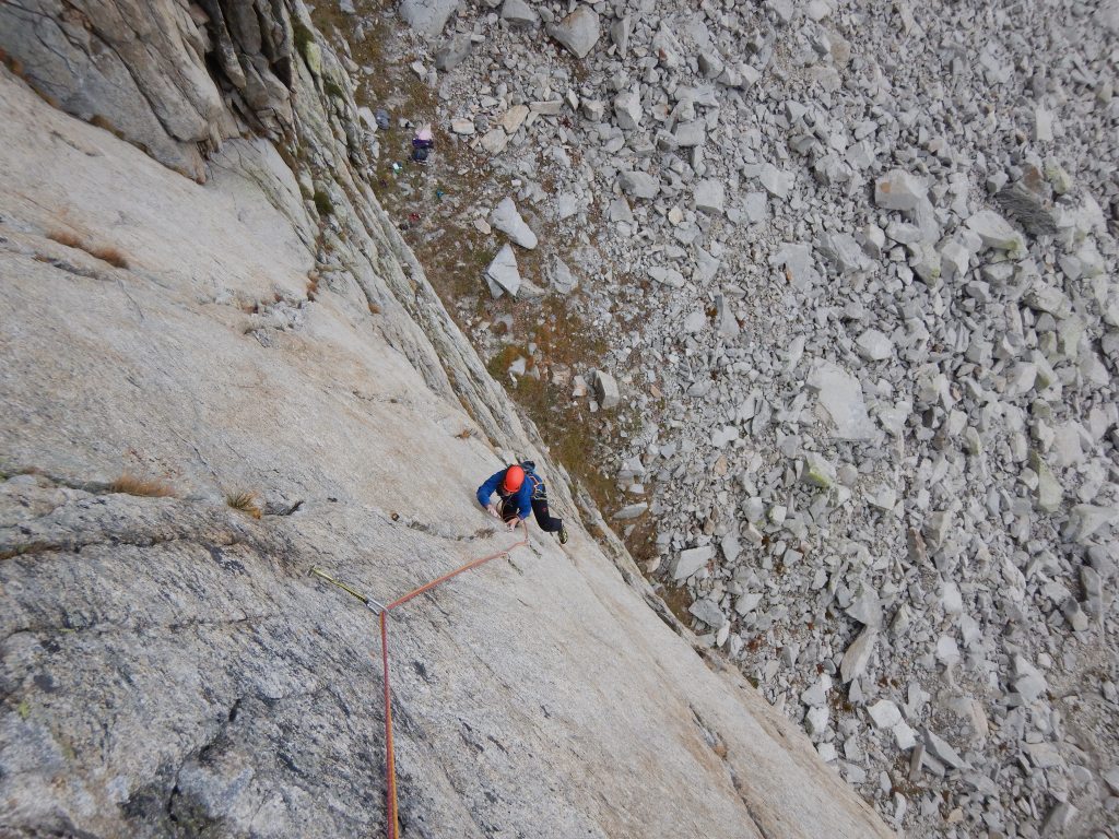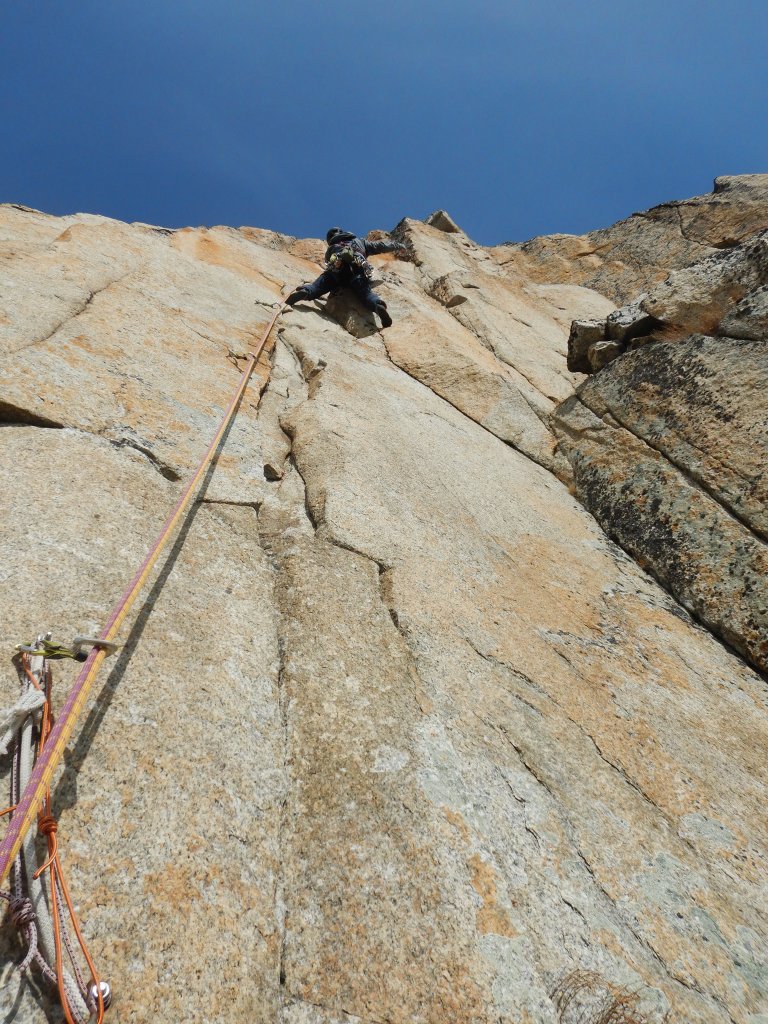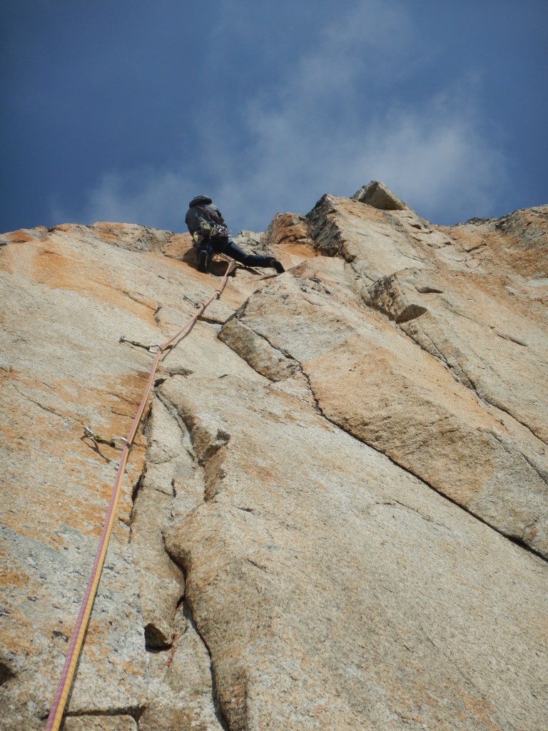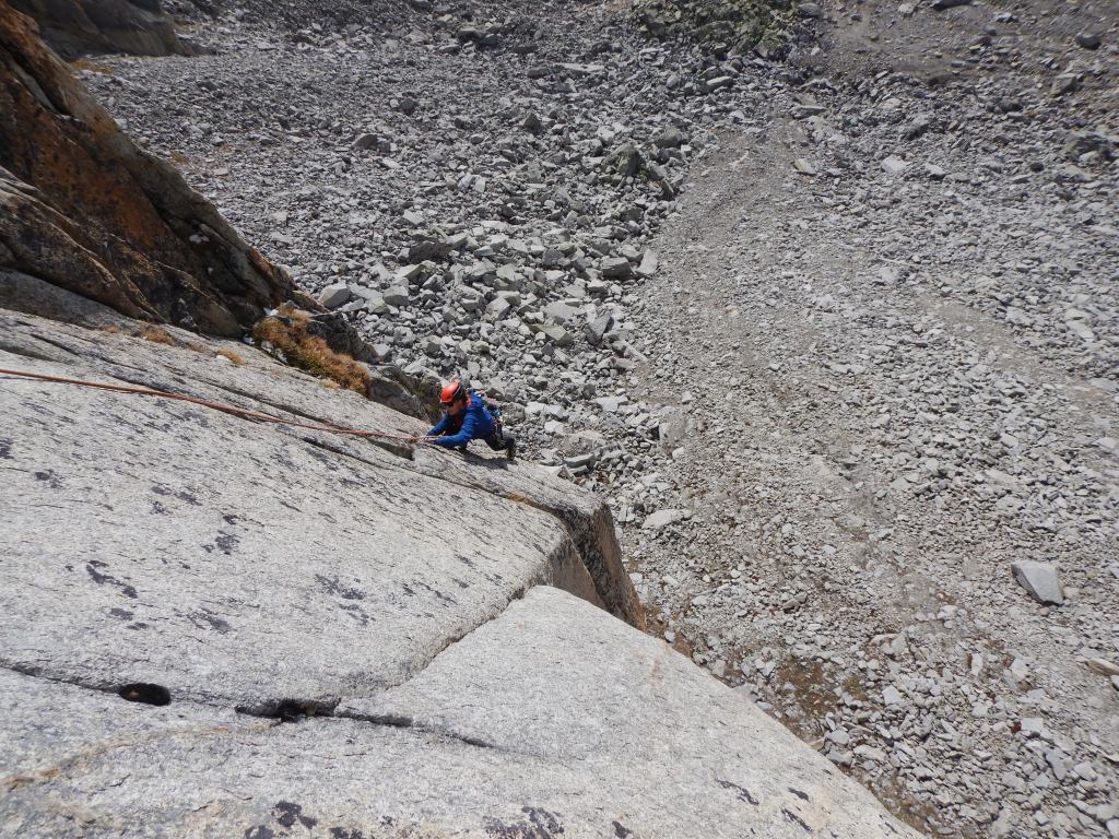 Nach kurzer Abseilerei starten wir gleich in die nächste, hoch gelobte Route an dieser Wand, der Danielli-Pohl. In Sachen Qualität und anhaltenden Schwierigkeiten steht sie ein wenig im Schatten von der „Musique…“, aber auch diese Route hat (vorallem in den ersten beiden SL) fantastische Risse und Verschneidungen. Auch hier die Bilder von dieser Route.