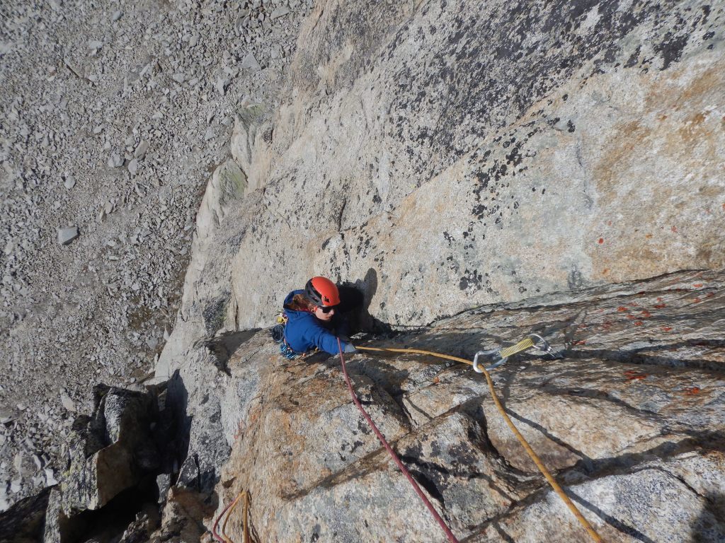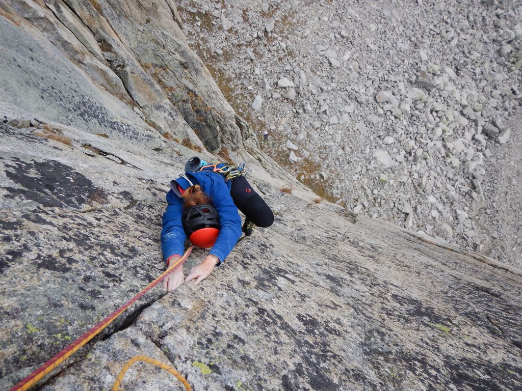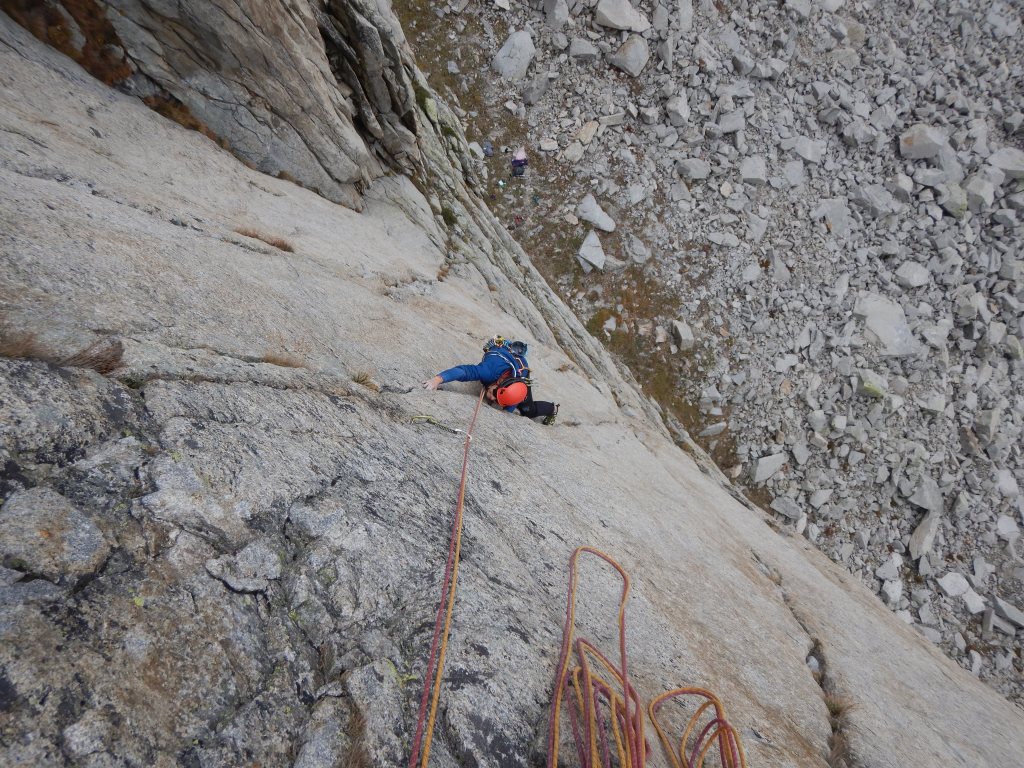 Etwas vom feinsten, das man an Rissen, Schuppen und Verschneidungen klettern kann und steht den Routen in Chamonix oder dem Furkapass in nichts nach! Die Absicherung ist gut, dennoch können je nach psychischer Verfassung Friends nützlich sein.