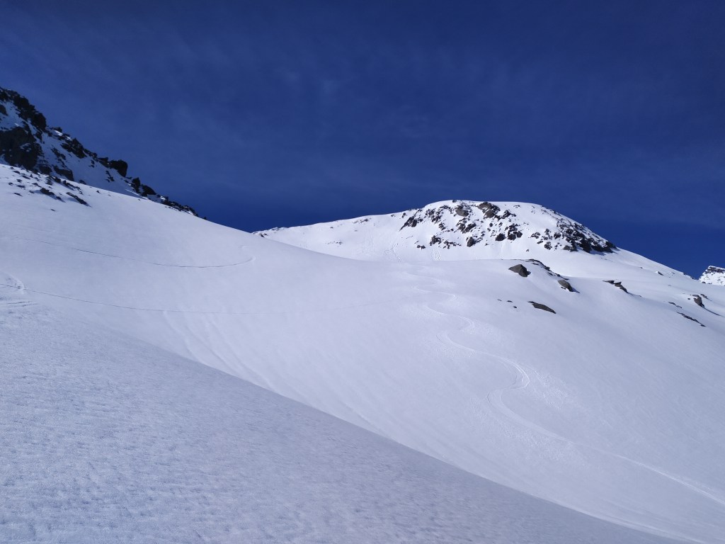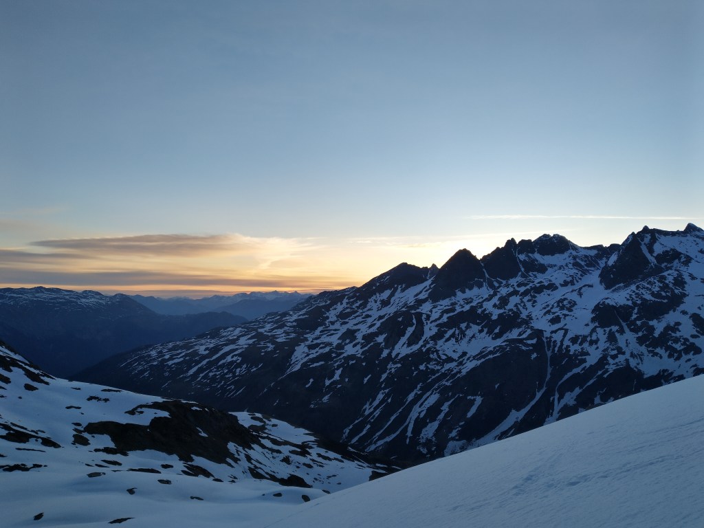 Um 5:30 geht’s los am Zollhaus des Splügenpasses. Der Schnee ist am Start bereits sumpfig, ich hoffe es bessert sich noch. 200-300hm höher steige ich schon auf knallharter Unterlage meinem Ziel entgegen. Eine Stirnlampe habe ich heute nicht gebraucht, da es schon um 6:00 taghell war. Um 6:15 stehe ich unter dem Lattenhorn auf 2560mü.M. und ziehe das erste Mal die Felle von den Skiern. In dessen steiler Nordflanke geht’s zügig runter und nach Norden um dann im Tal bei 2450m.ü.M. wieder die Felle aufzuziehen. Hier hat es bereits grosse Nassschneeablagerungen, welche klar zeigen, dass bei weiterer Erwärmung die Schneedecke zu rutschen beginnt. Ich beeile mich, denn die Sonne brennt voll rein und ich quere unter sehr steilen sonnenbeschienenen Hängen durch um zum Sattel am Anfang des Nordgrates zu gelangen. Diese Idee verwerfe ich wieder als sich oberhalb von mir eine super Schneerinne auftut, mit welcher ich sowieso schon geliebäugelt hatte vor der Abfahrt, als ich sie sah.