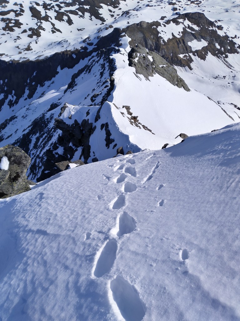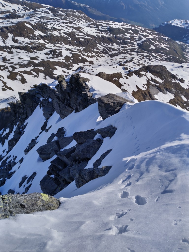 Blick von oben nach der Schlüsselstelle, weit unten auf dem Grat sind meine Spuren auch noch sichtbar
