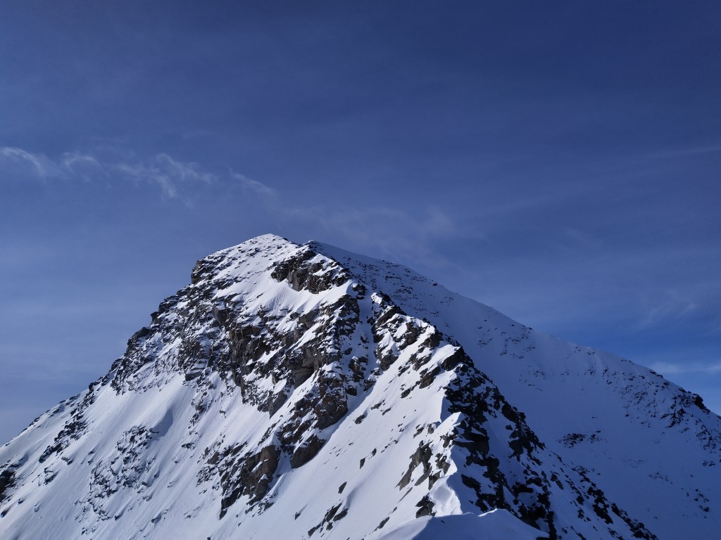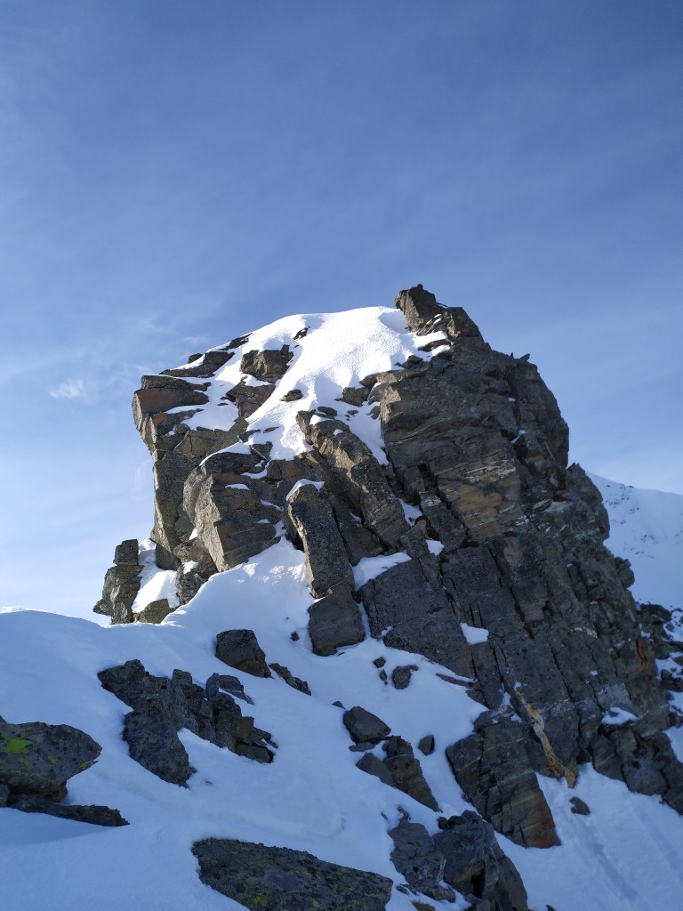 Schon mehrmals stand ich auf dem Gipfel und jedes Mal fragte ich mich, wie und ob wohl der Nordgrat, den man den ganzen Aufstieg über sieht, auf den Piz Tambo geht. Kurzentschlossen habe ich am Abend meine 7 Sachen gepackt und mir diesen als Ziel für den nächsten Tag gesetzt. Im Sommer soll der Grat laut Internetberichten im Bereich T5 und II sein, sollte also wohl machbar sein mit ein bisschen Schnee und den Skiern auf dem Rücken.