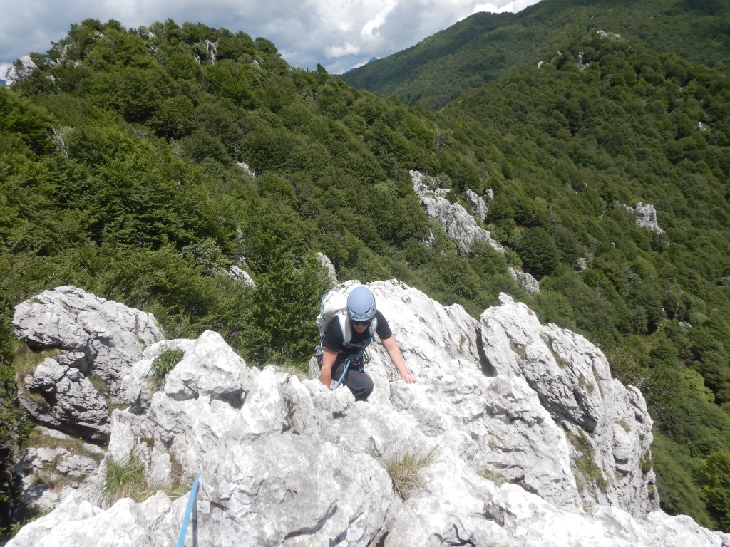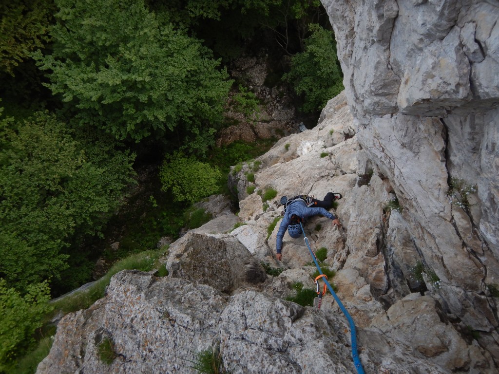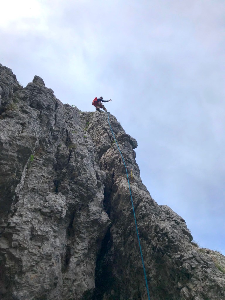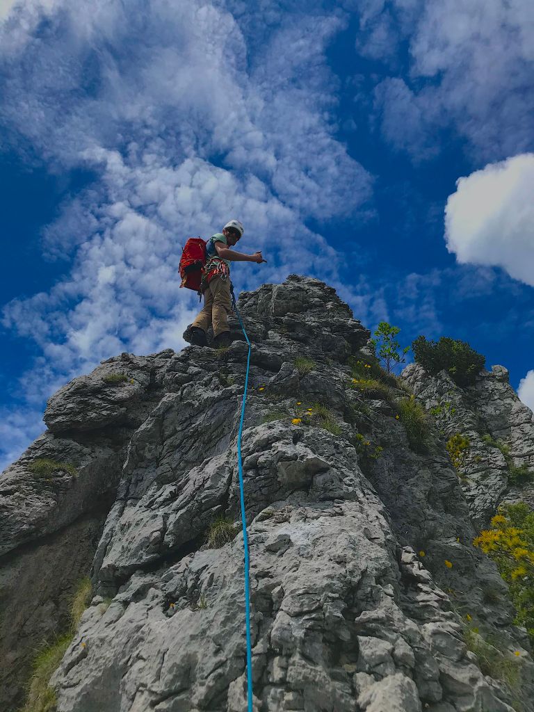 Geklettert haben wir aber noch nicht genug und wir gehen noch zum Sektor „Scalinatella“, bei welchem wir aus Versehen in die falsche Route einsteigen und die Startseillänge sich für einen 3er doch ziemlich streng anfühlt, Daniela klettert diese aber nach kurzer Ratlosigkeit Sturzfrei und souverän hinterher. Wir lassen uns aber nicht beirren und klettern noch bis zum Ausstieg der „Improvvisazione“ bei super Wetter und schöner Umgebung, Die Kletterei bis hierhin war wirklich super. Hier wird nun schnell klar warum die Route diesen Namen hat. Ein Abseilen ist wohl möglich, gleicht aber eher einer Begehung durch unerforschten Urwald. Wir klettern also kurz weiter über die Felsen und durchsteigen dann am kurzen Seil gesichert den Botanikabschnitt, bis wir wieder an Felsen gelangen. Hier klettern wir am kurzen Seil einfach über die wunderschöne Dolomitstruktur bis auf die Gratkante und gelangen an die „Scalinatella“ und über diese an den Ausstieg aus der Route.