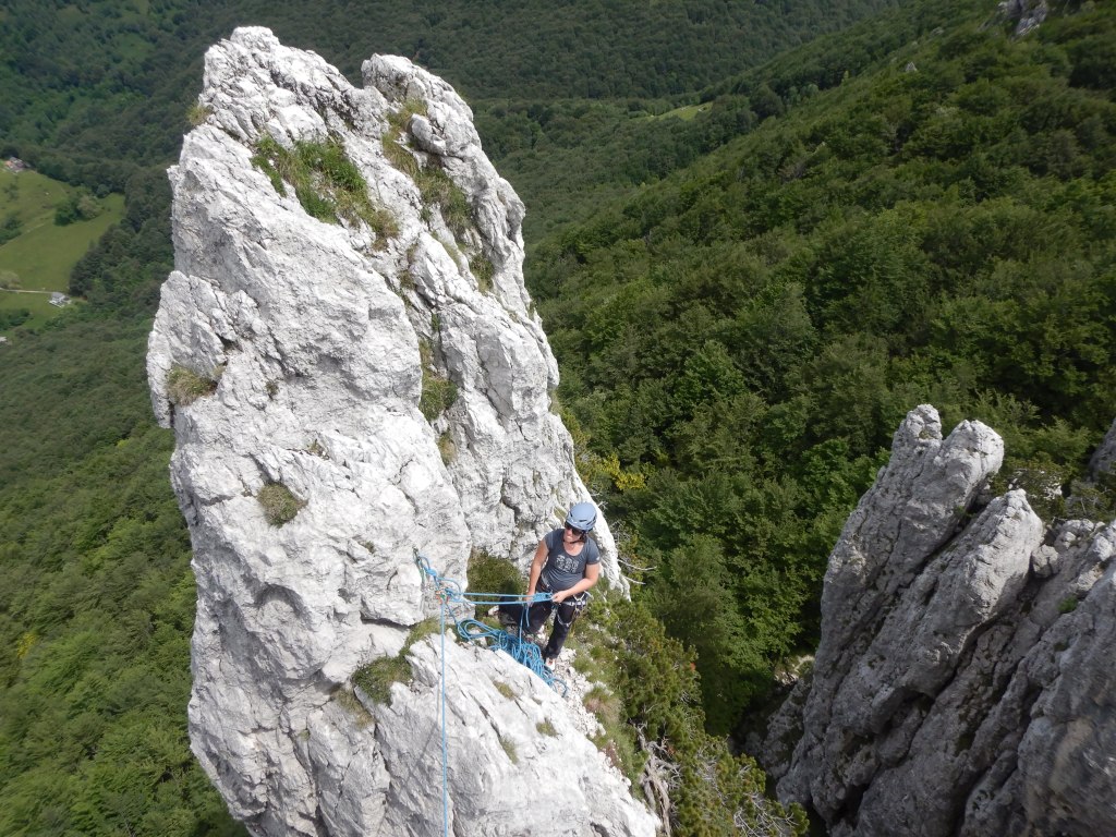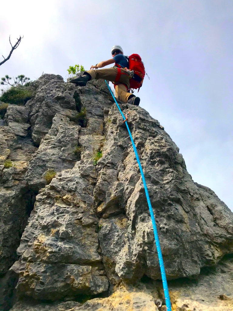 – Entweder 50m Halbseile oder wie wir 50m Einfachseil mit Rapline für längere Abseilstellen (vielfach kann auch von den Türmen abgestiegen werden)
