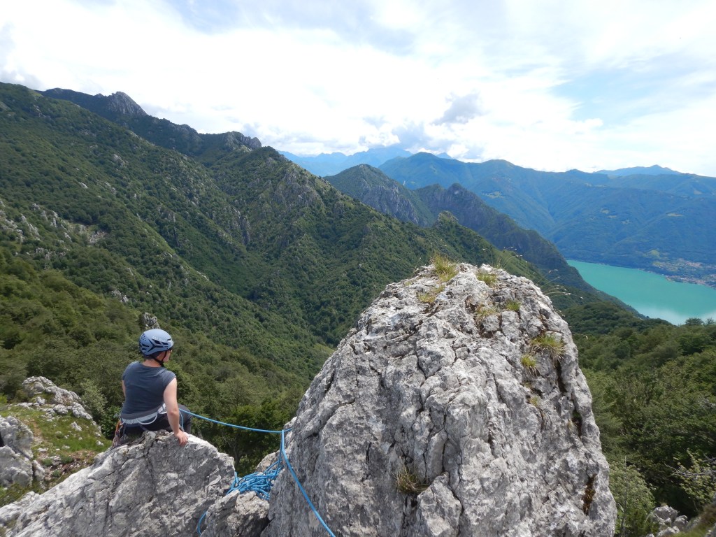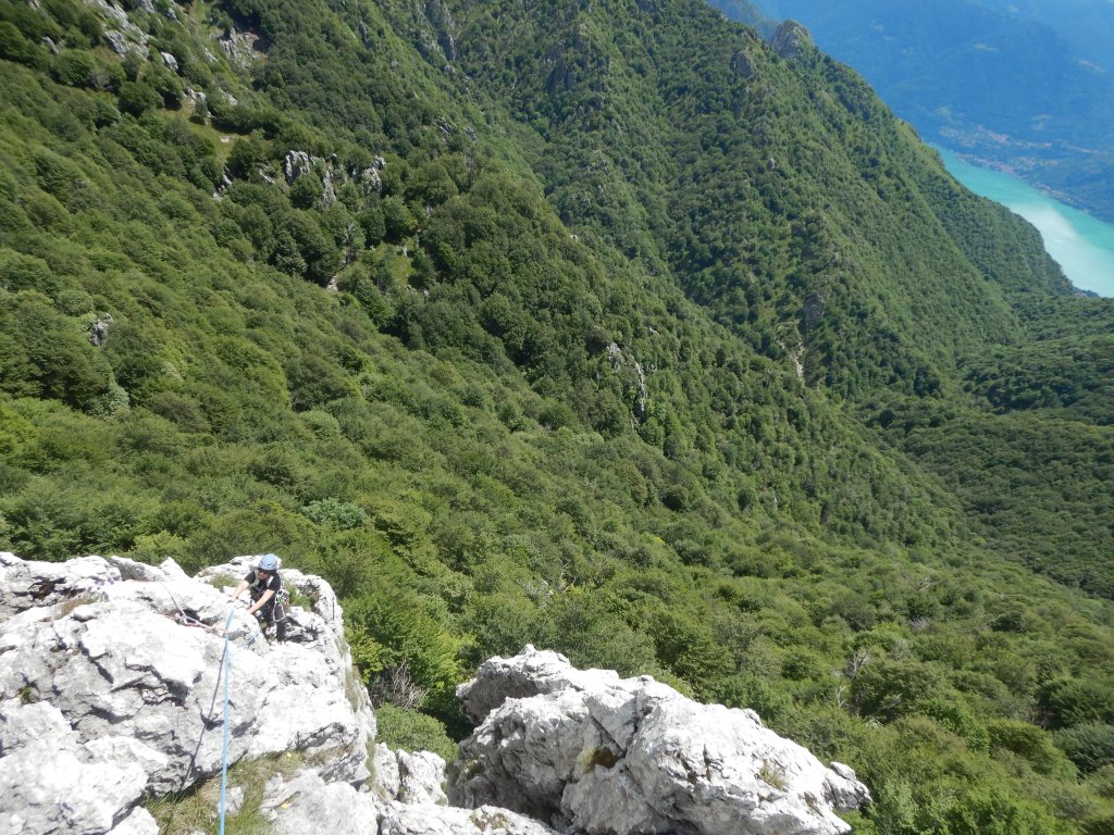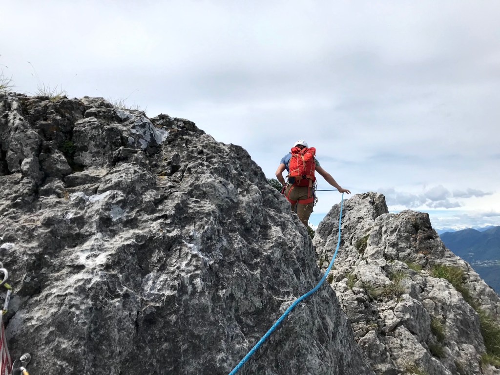Der nächste Tag beginnt um 8:00 Uhr morgens wo wir nach Kaffee und Frühstück bei bereits warmen Temperaturen losgehen. Heute wollen wir die klassische Route am „Spigolone“ klettern. nach 45 Minuten stehen wir am Einstieg und ich beginne zu klettern. Dolomitmässig steil geht’s los und die Verschneidung kurz vorm Stand wird sogar noch leicht überhängend. Die nächste Seillänge gestaltet sich etwas einfacher immer noch der Verschneidung folgend. Die 3. und unsere letzte gekletterte SL dieser Route beinhaltet ein Quergang, welcher auf die luftige Kante und weiter zum Standplatz führt. Der Quergang ist gut abgesichert, aber direkt nach dem Stand wäre ein Sturz für den Nachsteiger sehr unangenehm in die Verschneidung hinein.