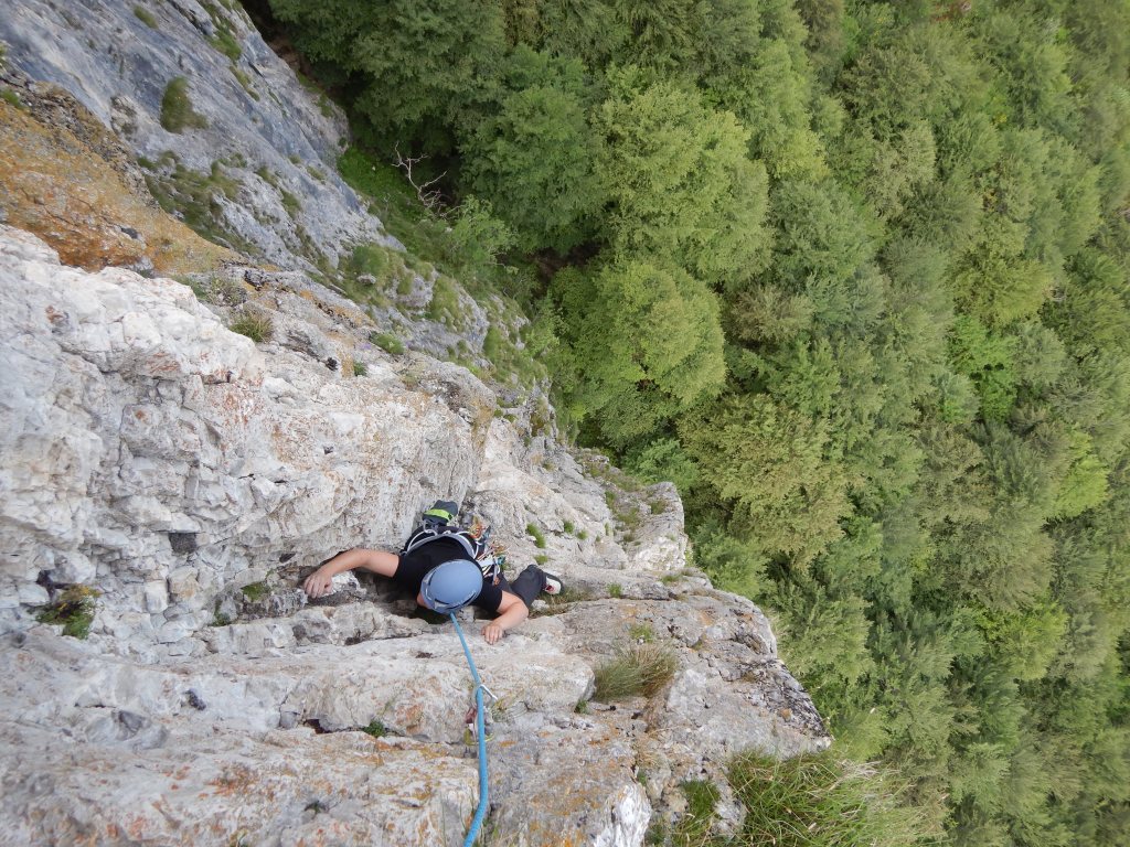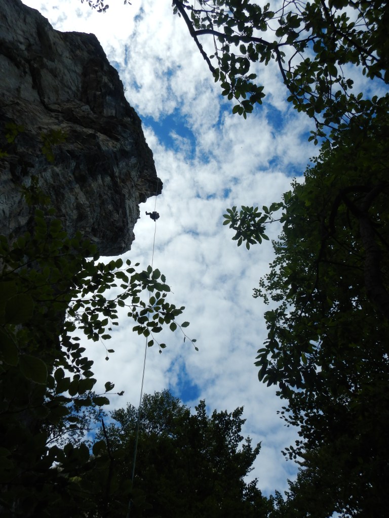 Abseilen können wir schliesslich vom obersten Standplatz direkt 45m Nordseitig überhängend bis zum Wanderweg zurück. Hier habe ich die Rapline dabei, dass wir die volle Länge runter kommen.