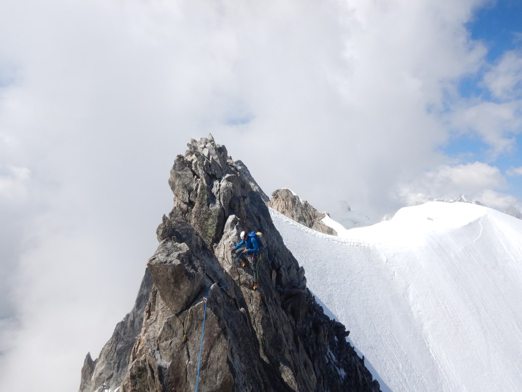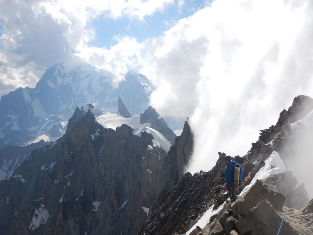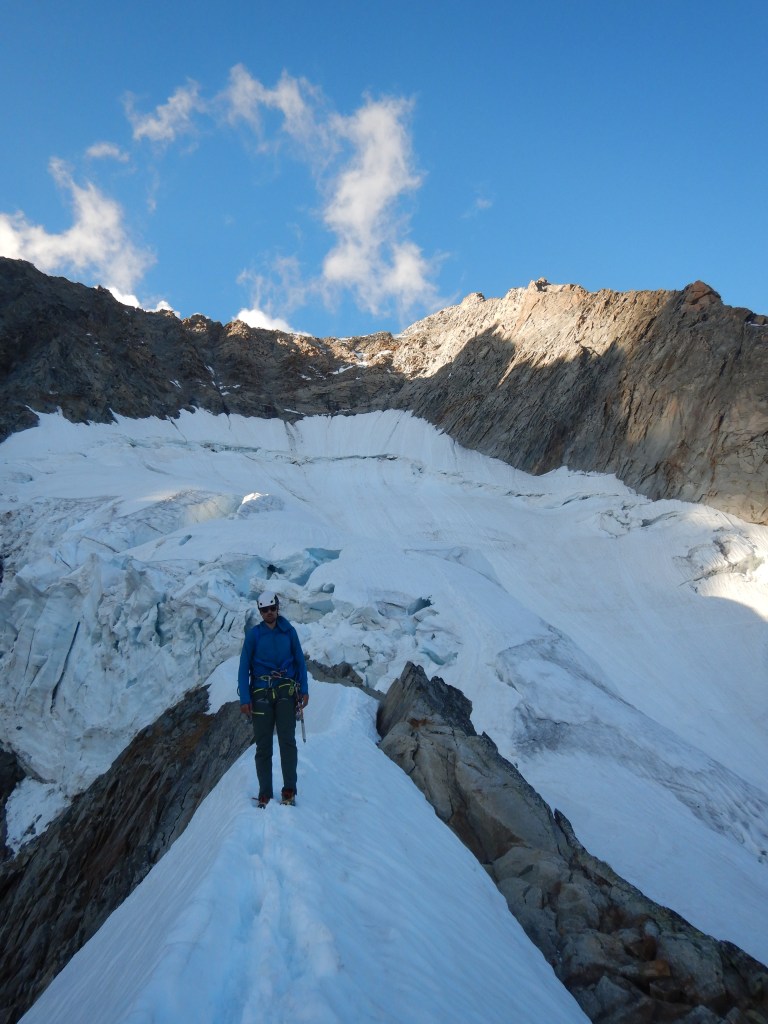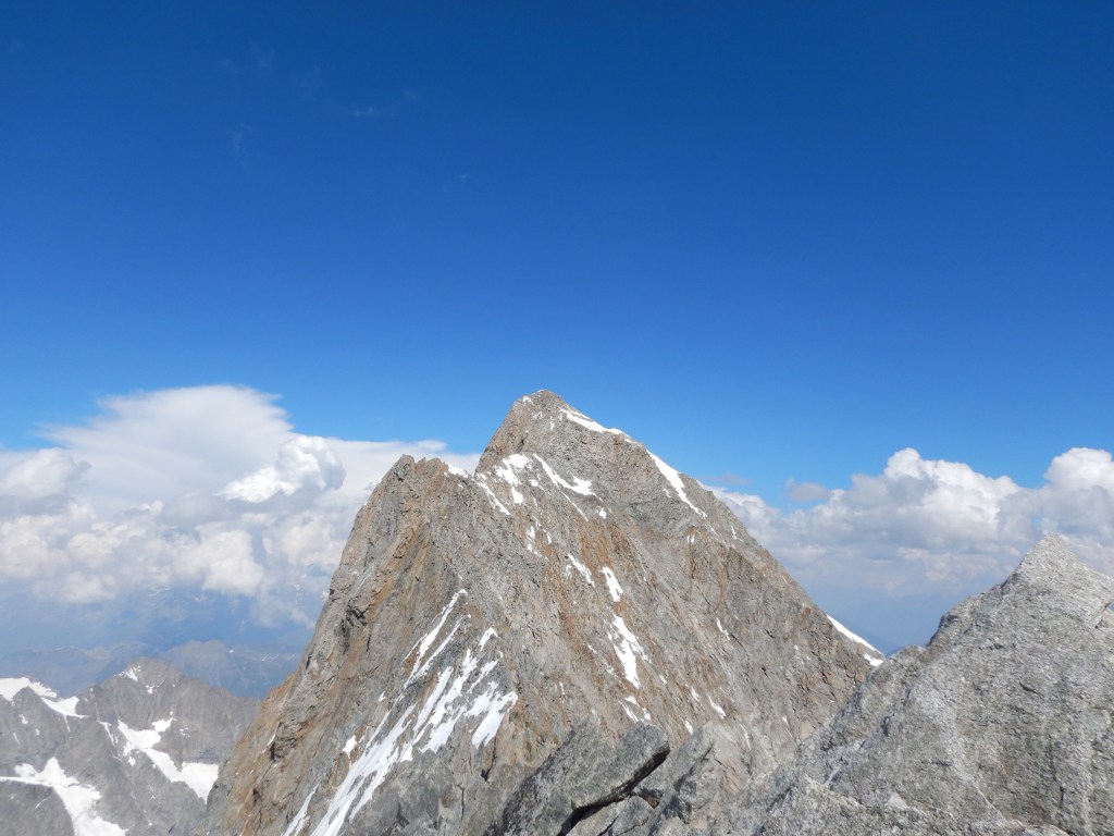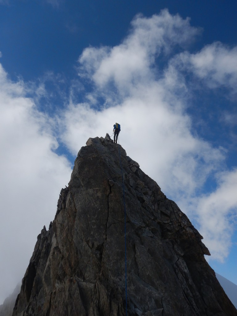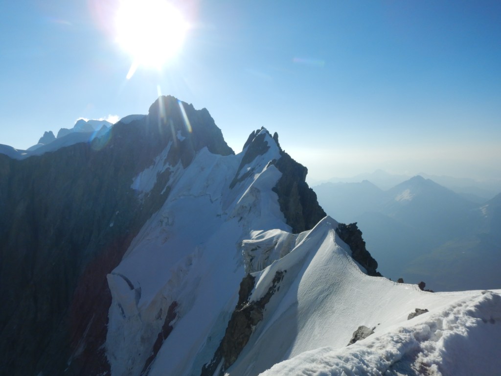 Weiter gings immer dem Grat entlang, meist in der Nordseite ausweichend und ab und zu mit kleinen Abseilern (Makramee!;) für schnelleres vorankommen ohne Seil fädeln). Der Fels auf die Pointe Hélène war nochmals sehr speziell, man wusste nicht wirklich was hält und was nicht und das simultane Klettern brauchte doch etwas an Vorsicht. Immer dem Grat folgend wird’s nun immer einfacher, bis man auf dem Gipfel der Pointe Whymper steht. Es ist erst 17:45 und wir sind froh, dass alles mehr oder weniger Reibungslos gelaufen ist.