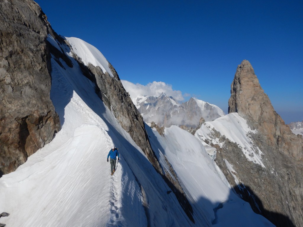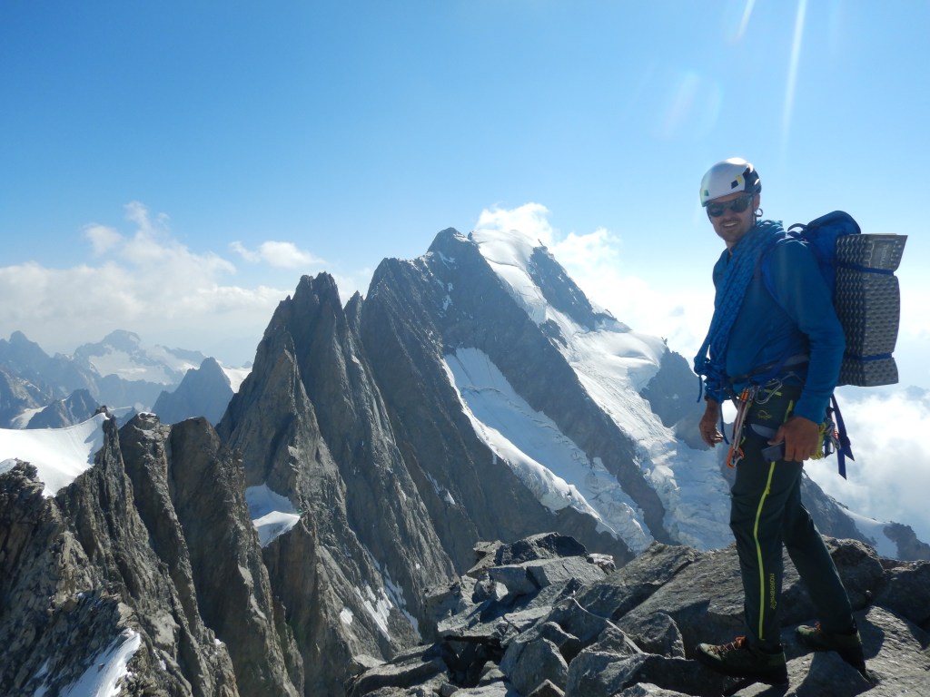 Lange (nicht ganz so lange wie gedacht) und ausgesetzte Tour über mehrere unglaublich coole und prominente Gipfel in der besten Region der Alpen. Ein gutes Gespür für die Routenfindung und Einschätzung der Felsqualität ist ein grosser Vorteil, denn ausser an der Pointe Young ist der Fels eigentlich überall nicht bombenfest. Die Schwierigkeitsangaben stimmen eigentlich überall ziemlich gut wobei die Pointe Young wohl viel angenehmer am Mittag (nur nass, nicht eisig) ist. Startet man hier frühmorgens direkt aus dem Biwak in die eisige Schlüssellänge kann sich das ziemlich sicher härter anfühlen als V/+ 😉