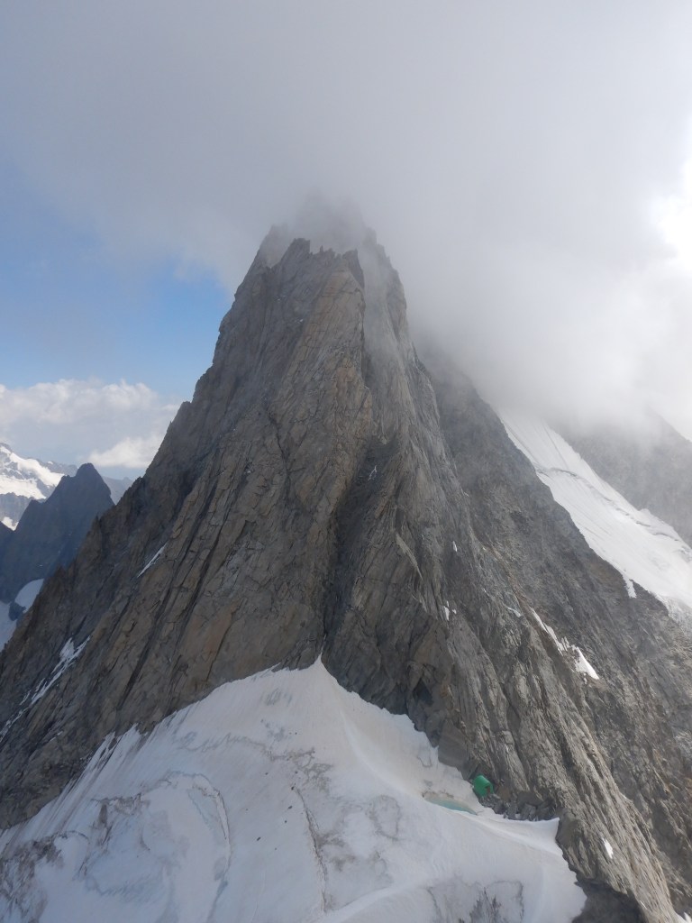 Die Entscheidung wo wir schlafen wird uns vom Donnergrollen, welches immer öfters und näher kam, abgenommen. Die Pointe Walker lassen wir links liegen, da es weder eine technische Herausforderung, noch ein grosses Ausdauerproblem gewesen wäre, dort noch hoch zu gehen. Absteigen wollten wir nämlich über die Whymperrippe, da der Sérac über den Abstieg der Walkerrippe bereits schonmal abgegangen war und wir dieses Risiko nicht auf uns nehmen wollten.