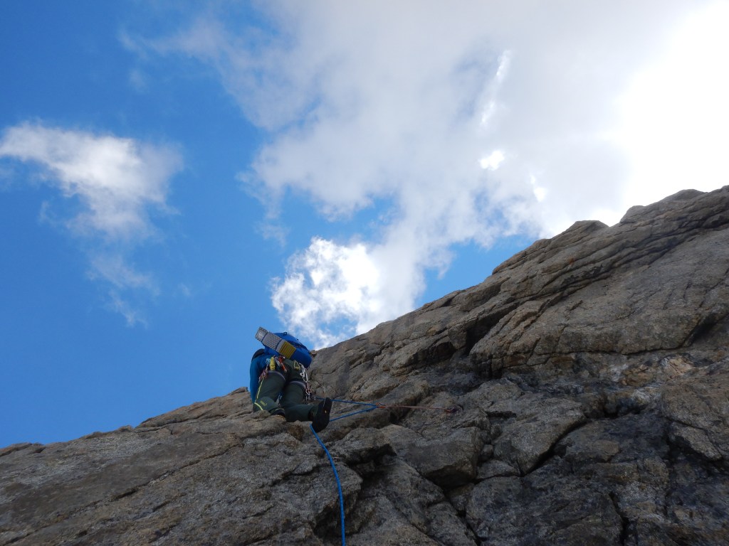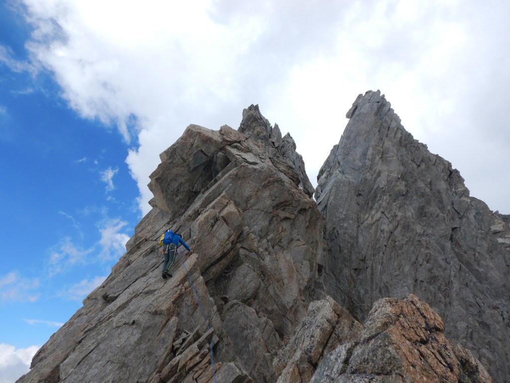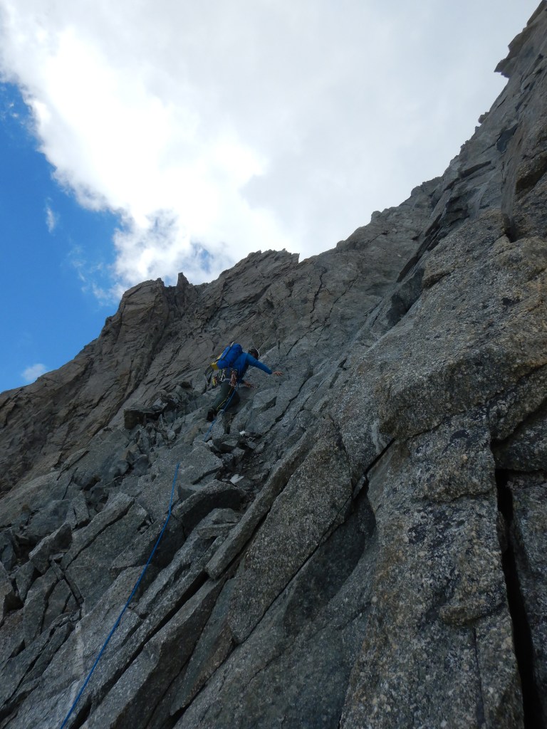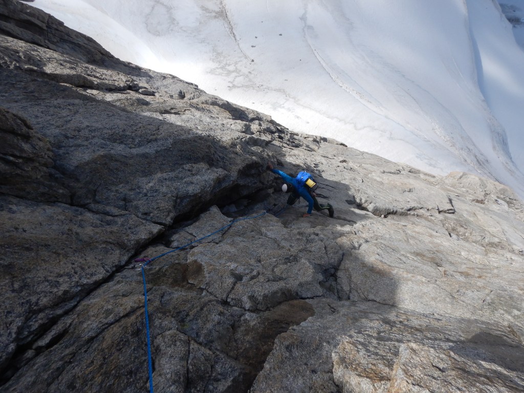 Der nun folgende Aufstieg auf die Pointe Young ist klettertechnisch die Schlüsselstelle, wobei die 2. Seillänge, mit zuerst plattigen Moves und dann einem nassen Cheminée, wohl die Schlüssellänge darstellt. Danach geht’s immer fordernd aber deutlich einfacher zuerst ein wenig Links und dann wieder gerade hoch bis auf den Grat. Wir wechseln uns nach jeweils ein paar Seillängen ab, damit jeder etwas vom Wegfinden hat.