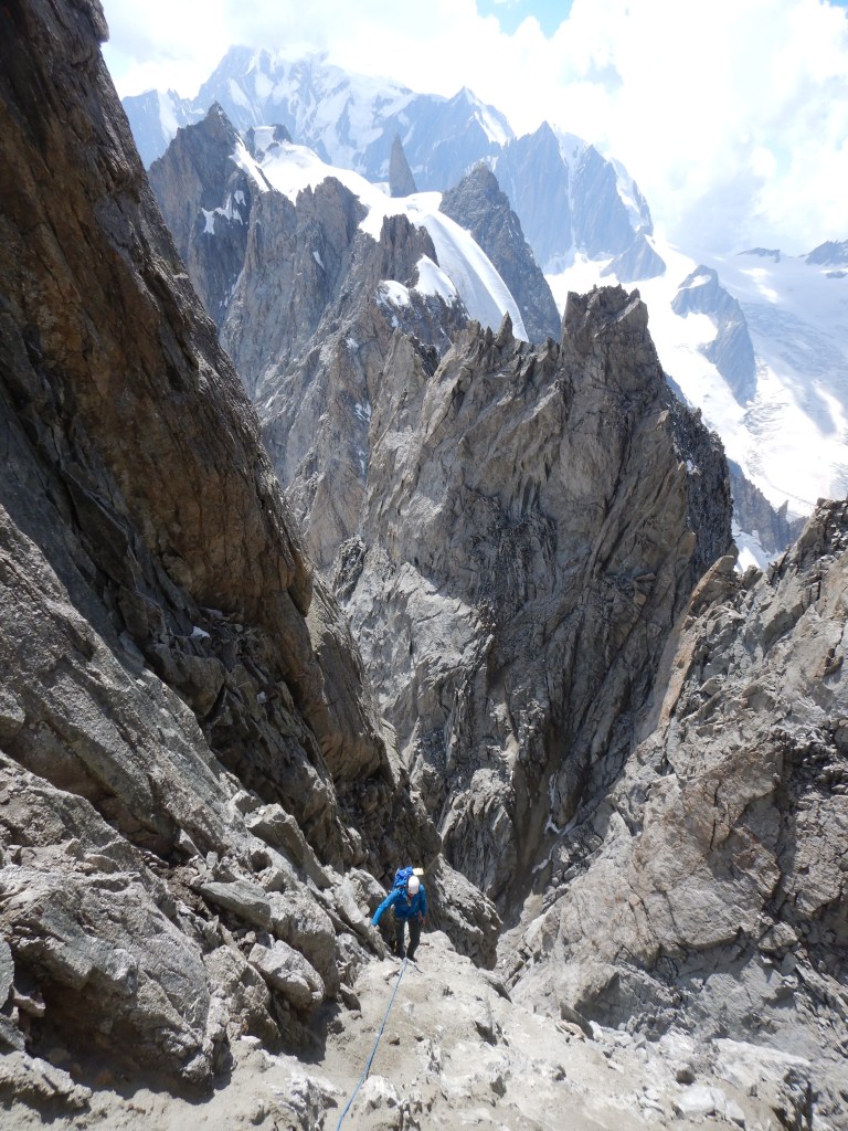 Vom Gipfel steigt man nun noch etwa 20-30m auf der Chamonix-Seite ab und findet dann da den richtigen Abseilstand, von welchem man mit 1x Abseilen tiptop in die Scharte kommt. Von hier geht’s gerade hoch weiter und nachdem auf Bändern auf der Südseite gequert wird sollte ins darunterliegende Couloir abgeseilt werden. Wir haben das nicht richtig gemerkt und sind einfach weiter auf dem Grat weitergeklettert, bis wir 6m in eine Scharte abgeseilt haben. Hier gerade hoch weiter erschien mir ziemlich schwierig und fragwürdig, ob das wirklich machbar sein kann. Auch hingen hier schon Schlingen, welche auf ein Abseilen hindeuteten. Der Blick hinunter sah eindrücklich aus: Lose, überhängend und nicht wieder hoch kletterbar. Wir verbessern noch den Stand und ich seile mich ab in den steilen Kamin. Am Seilende angekommen finde ich etwa 2m weiter unten einen improvisierten Stand mit Schlingen um einen eingekeilten Block im ziemlich losen Fels. Ich belaste ihn ganz vorsichtig und will mir gar nicht vorstellen, wie viel mehr er wohl ertragen würde. Echt ungeil!!! Naja, wir seilen an ebendiesem Stand noch einmal ab und kommen in das W-Couloir, welches „Mixedgelände“ auf den SW-Grat der Pointe Margherite bereithalten soll. Das Mixedgelände ist dann einfach Sand mit Steinen durchsetzt und meiner Meinung nach die absolut unangenehmste Stelle der gesamten Überschreitung.
