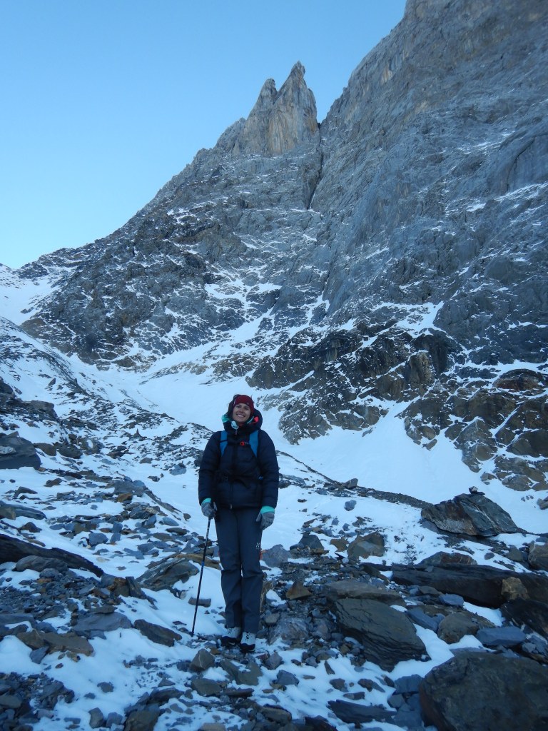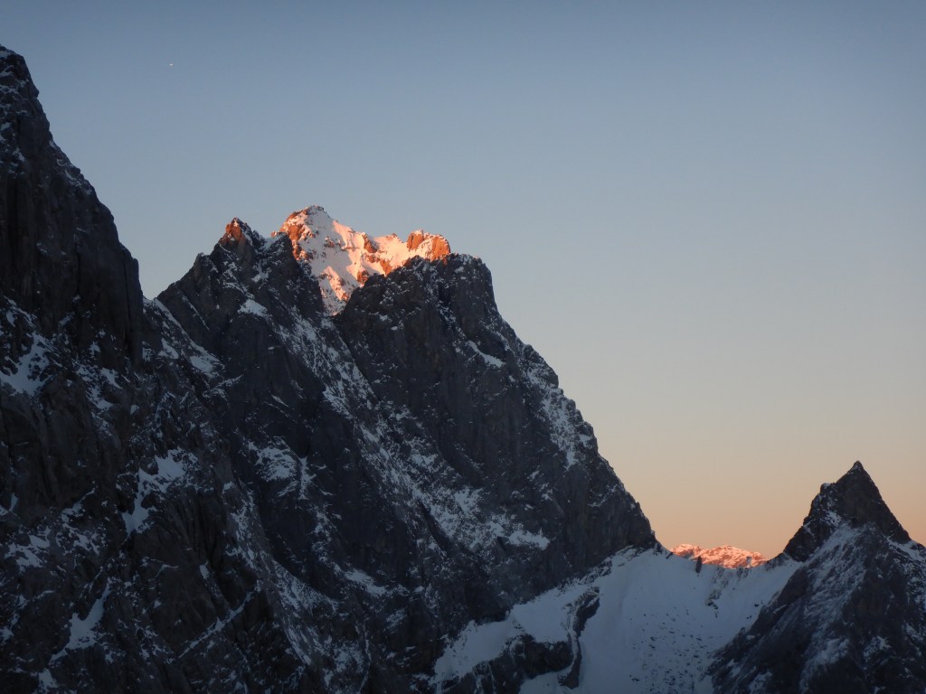 Um 6:25 gehen wir beim Auto noch im Schein der Stirnlampe in der Brunnialp los, es ist zwar -7°C aber der Aufstieg ist steil und schweisstreibend. Nach 1:20h stehen wir dann mit dem ersten Sonnenlicht (an den Gipfeln) am Einstieg.